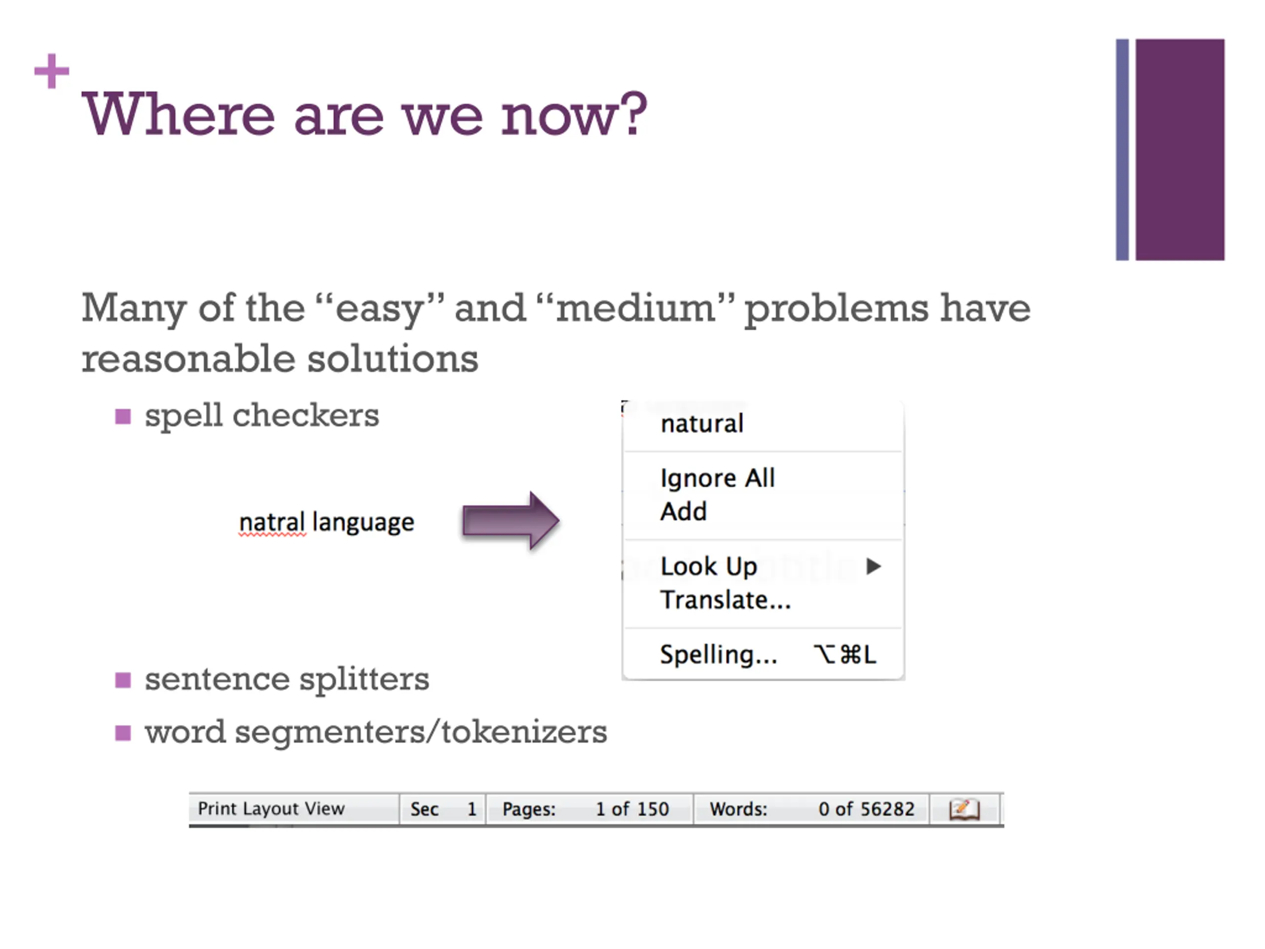 +Where are we now? Many of the easy and medium problems have reasonable solutions spell checkers sentence splitters word segmenters/tokenizers