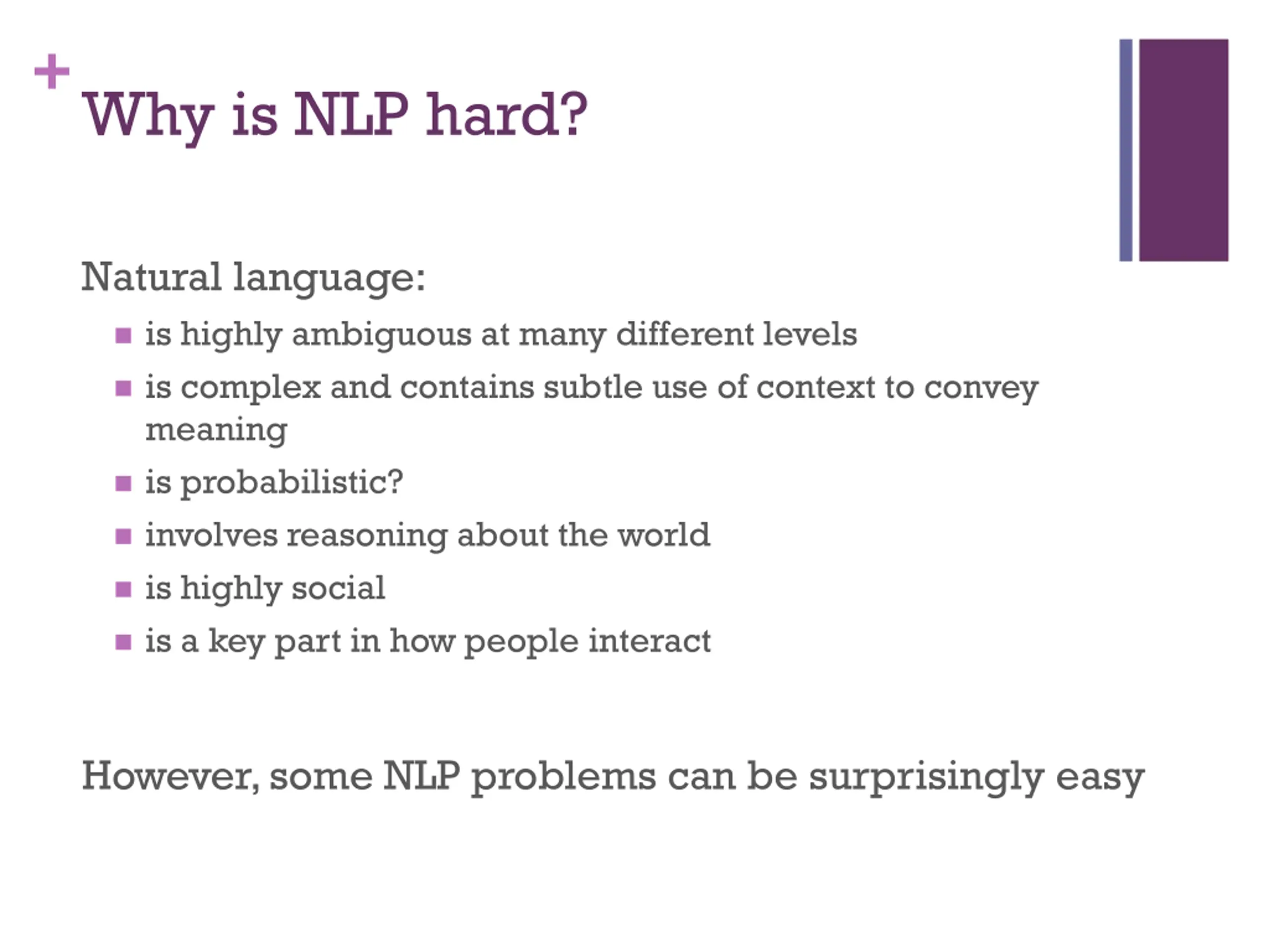 +Why is NLP hard? Natural language: is highly ambiguous at many different levels is complex and contains subtle use of context to convey meaning is probabilistic? involves reasoning about the world is highly social is a key part in how people interact However, some NLP problems can be surprisingly easy