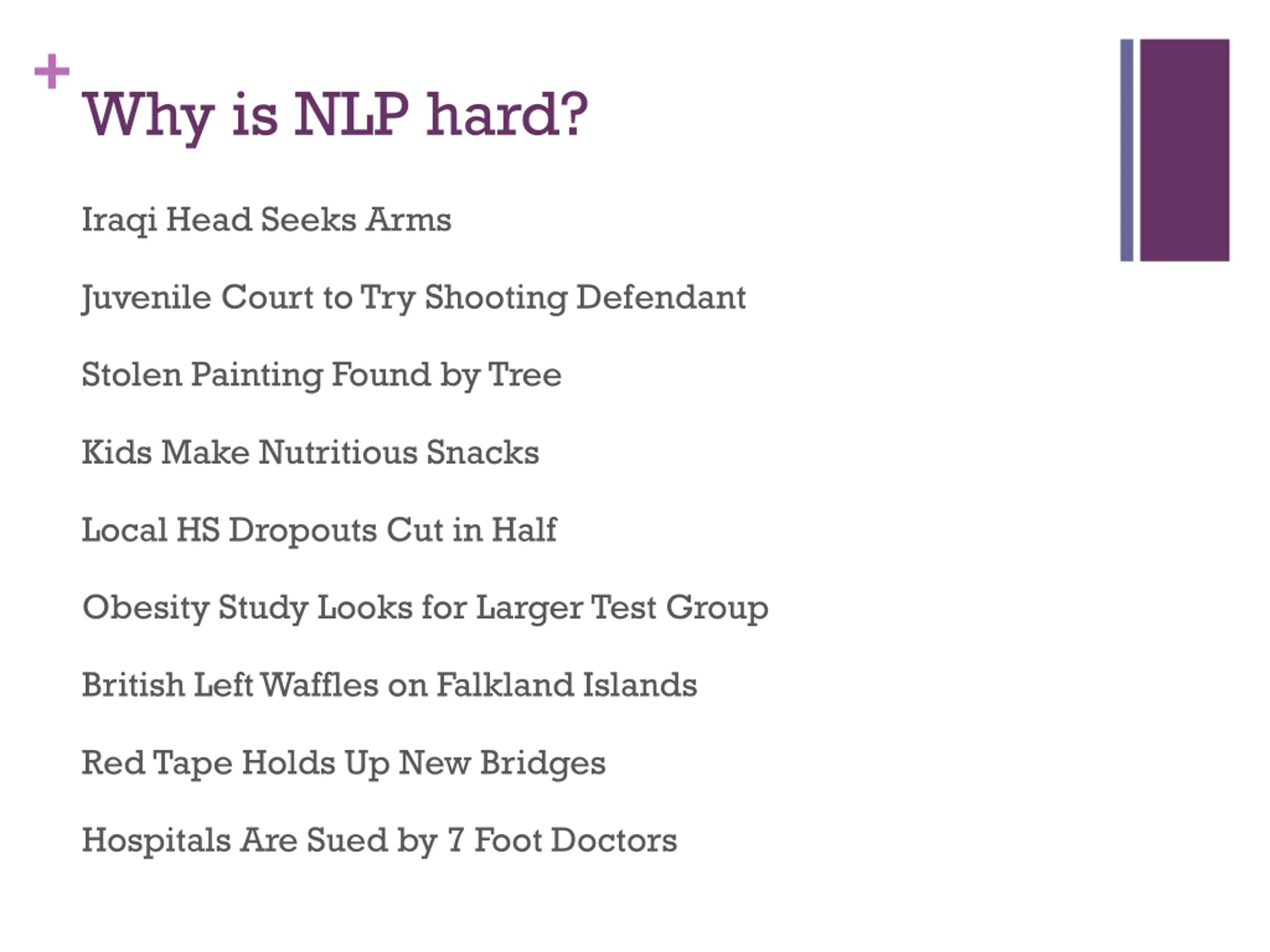 +Why is NLP hard? Iraqi Head Seeks Arms Juvenile Court to Try Shooting Defendant Stolen Painting Found by Tree Kids Make Nutritious Snacks Local HS Dropouts Cut in Half Obesity Study Looks for Larger Test Group British Left Waffles on Falkland Islands Red Tape Holds Up New Bridges Hospitals Are Sued by 7 Foot Doctors