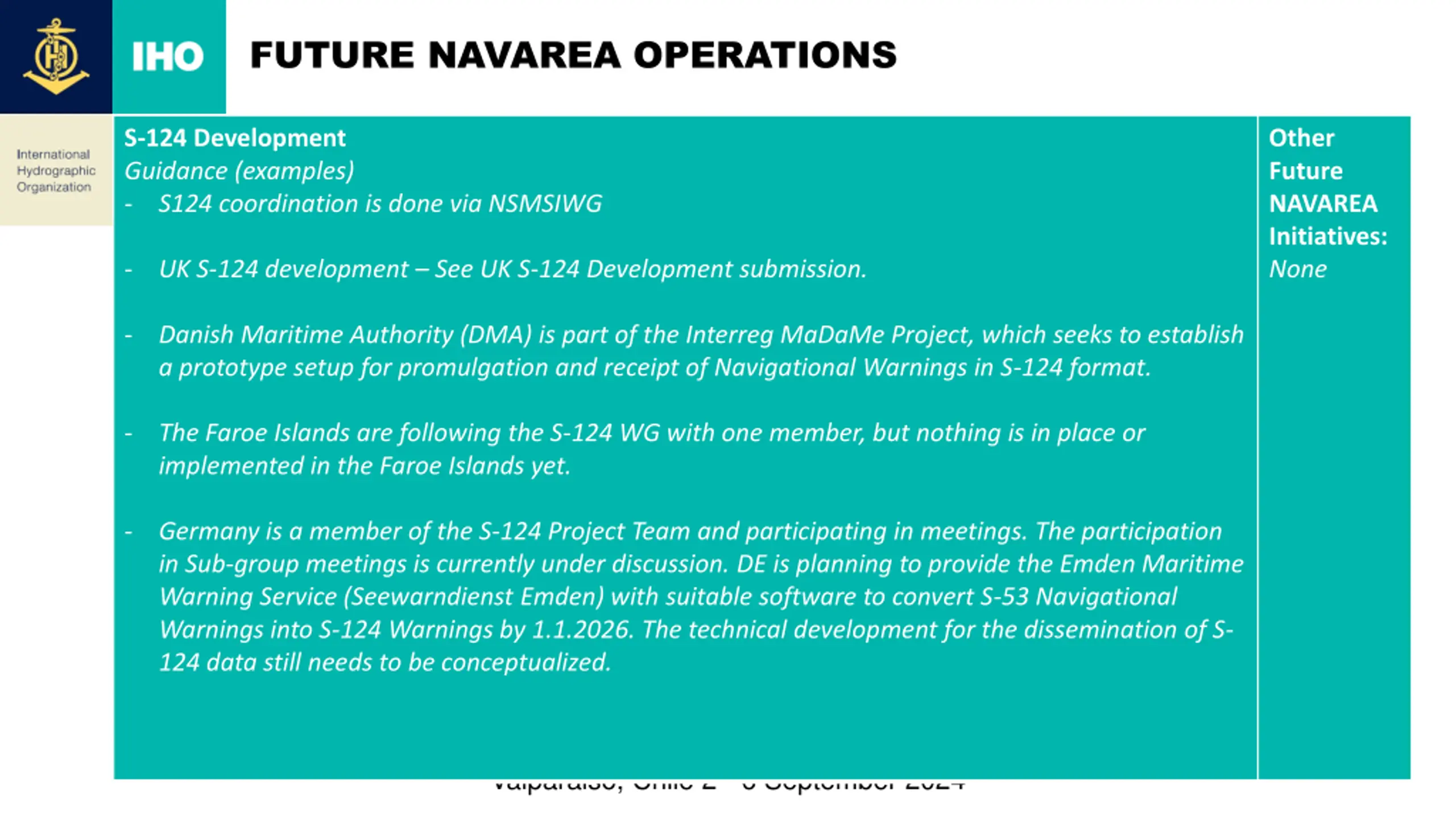 FUTURE NAVAREA OPERATIONS S-124 Development Guidance (examples) - S124 coordination is done via NSMSIWG Other Future NAVAREA Initiatives: None - UK S-124 development See UK S-124 Development submission. - Danish Maritime Authority (DMA) is part of the Interreg MaDaMe Project, which seeks to establish a prototype setup for promulgation and receipt of Navigational Warnings in S-124 format. - The Faroe Islands are following the S-124 WG with one member, but nothing is in place or implemented in the Faroe Islands yet. - Germany is a member of the S-124 Project Team and participating in meetings. The participation in Sub-group meetings is currently under discussion. DE is planning to provide the Emden Maritime Warning Service (Seewarndienst Emden) with suitable software to convert S-53 Navigational Warnings into S-124 Warnings by 1.1.2026. The technical development for the dissemination of S- 124 data still needs to be conceptualized. Valparaiso, Chile 2 - 6 September 2024