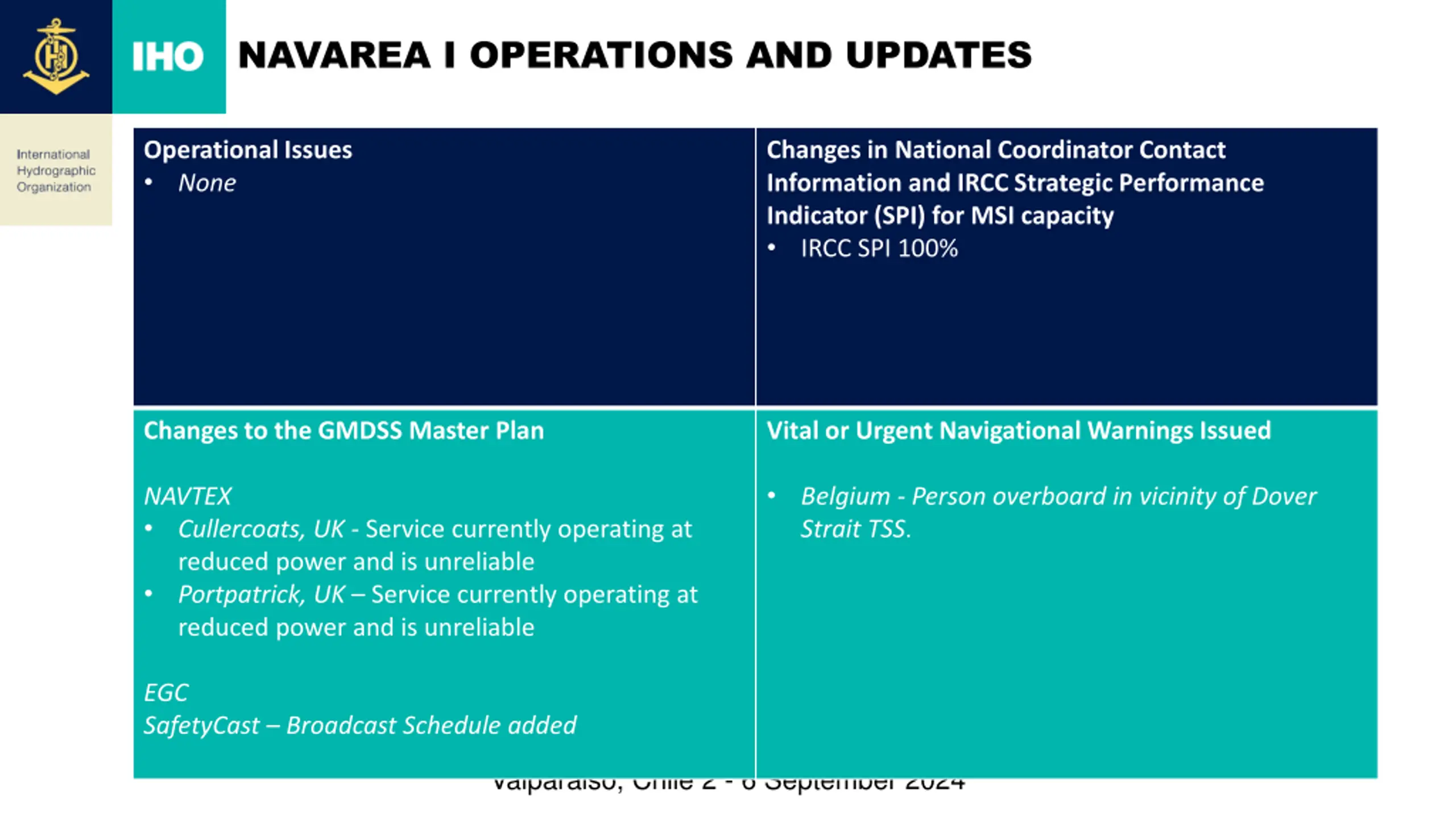 NAVAREA I OPERATIONS AND UPDATES Operational Issues None Changes in National Coordinator Contact Information and IRCC Strategic Performance Indicator (SPI) for MSI capacity IRCC SPI 100% Changes to the GMDSS Master Plan Vital or Urgent Navigational Warnings Issued NAVTEX Cullercoats, UK - Service currently operating at reduced power and is unreliable Portpatrick, UK Service currently operating at reduced power and is unreliable Belgium - Person overboard in vicinity of Dover Strait TSS. EGC SafetyCast Broadcast Schedule added Valparaiso, Chile 2 - 6 September 2024