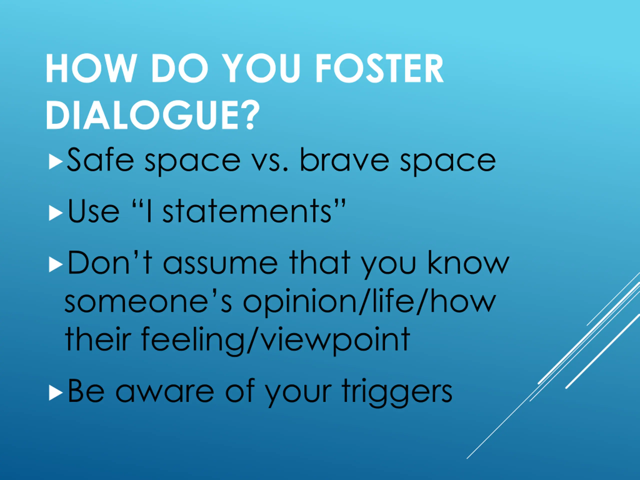 HOW DO YOU FOSTER DIALOGUE? Safe space vs. brave space Use I statements Don t assume that you know someone s opinion/life/how their feeling/viewpoint Be aware of your triggers