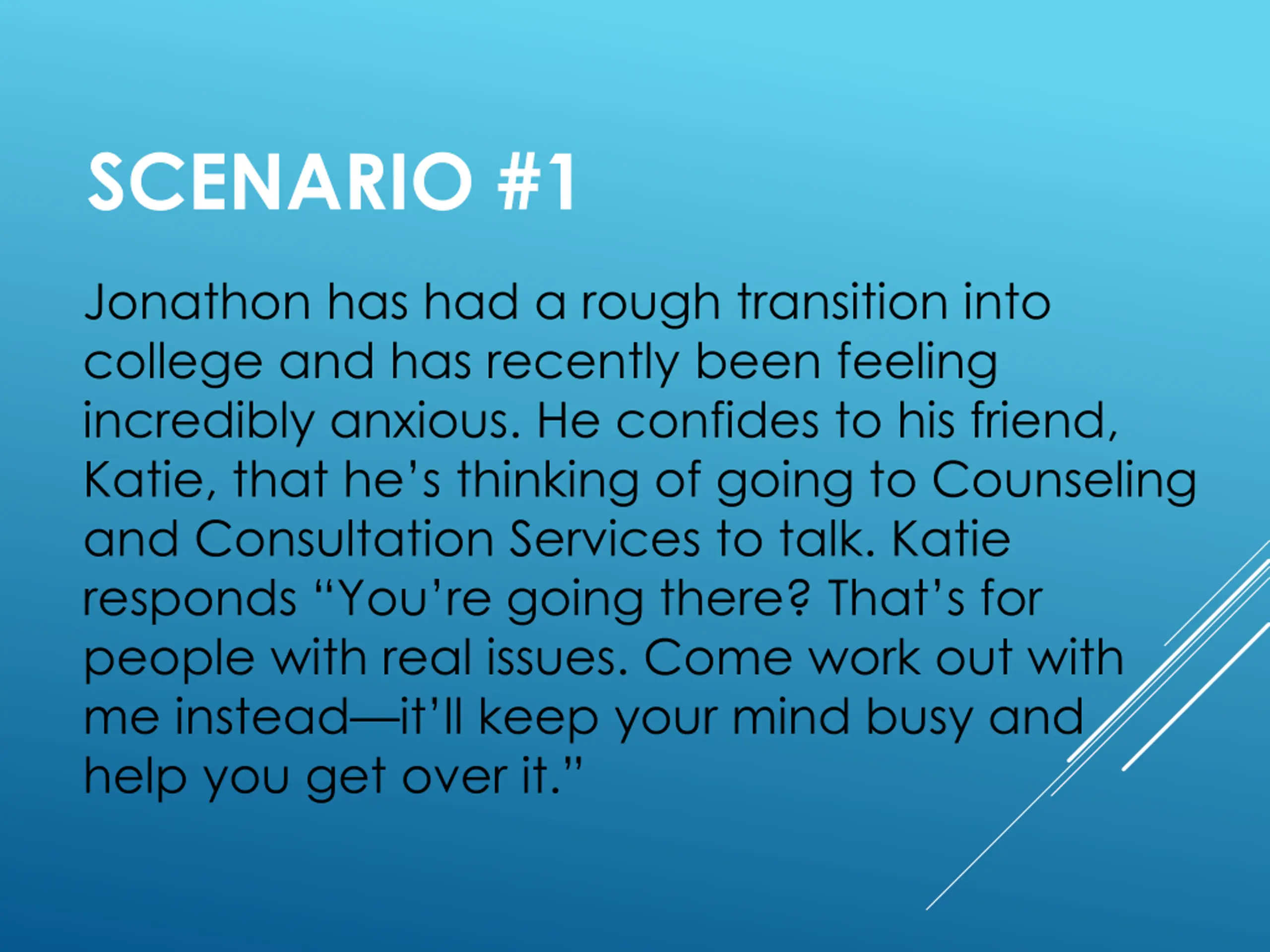 SCENARIO #1 Jonathon has had a rough transition into college and has recently been feeling incredibly anxious. He confides to his friend, Katie, that he s thinking of going to Counseling and Consultation Services to talk. Katie responds You re going there? That s for people with real issues. Come work out with me instead it ll keep your mind busy and help you get over it.