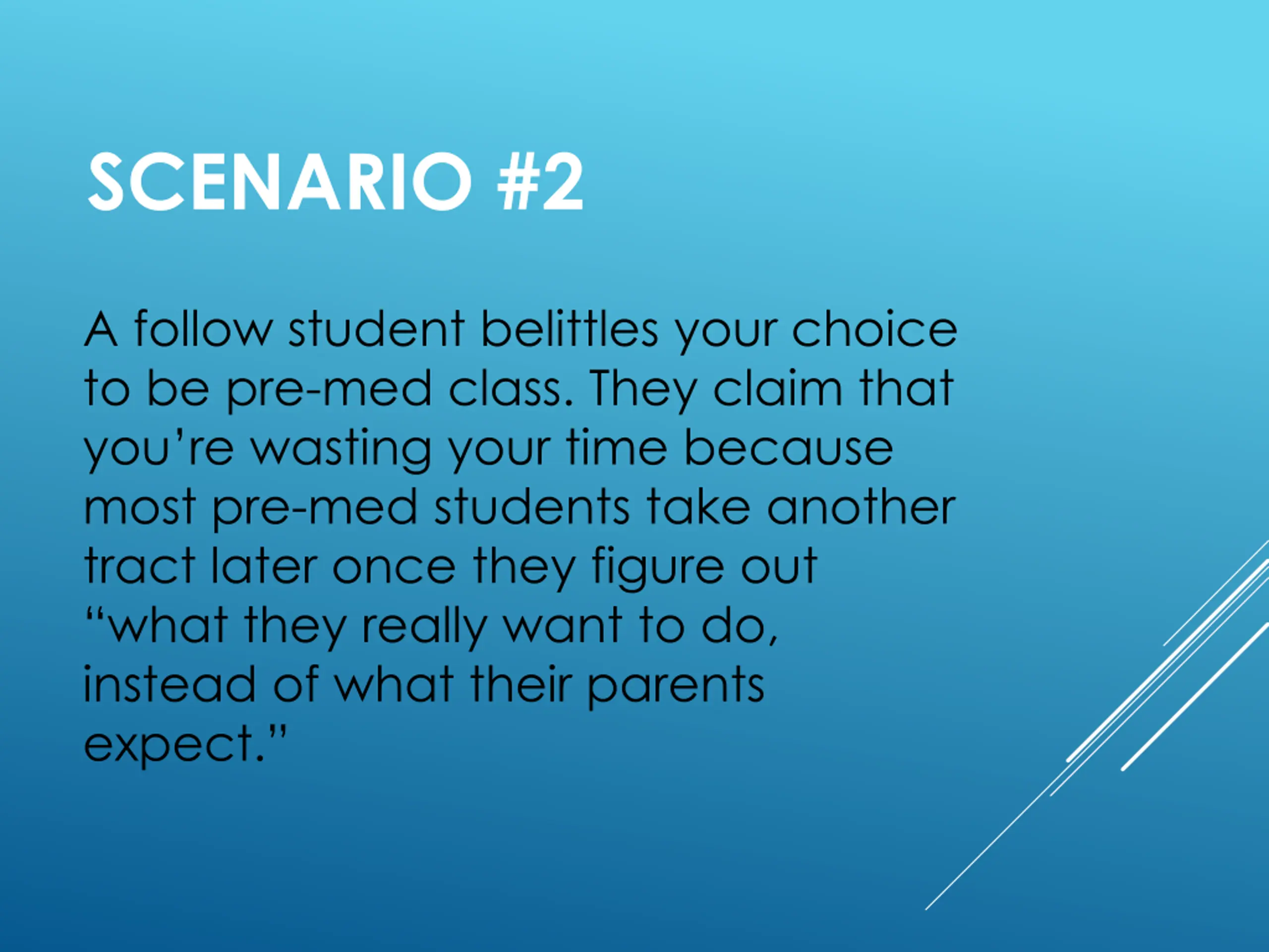 SCENARIO #2 A follow student belittles your choice to be pre-med class. They claim that you re wasting your time because most pre-med students take another tract later once they figure out what they really want to do, instead of what their parents expect.