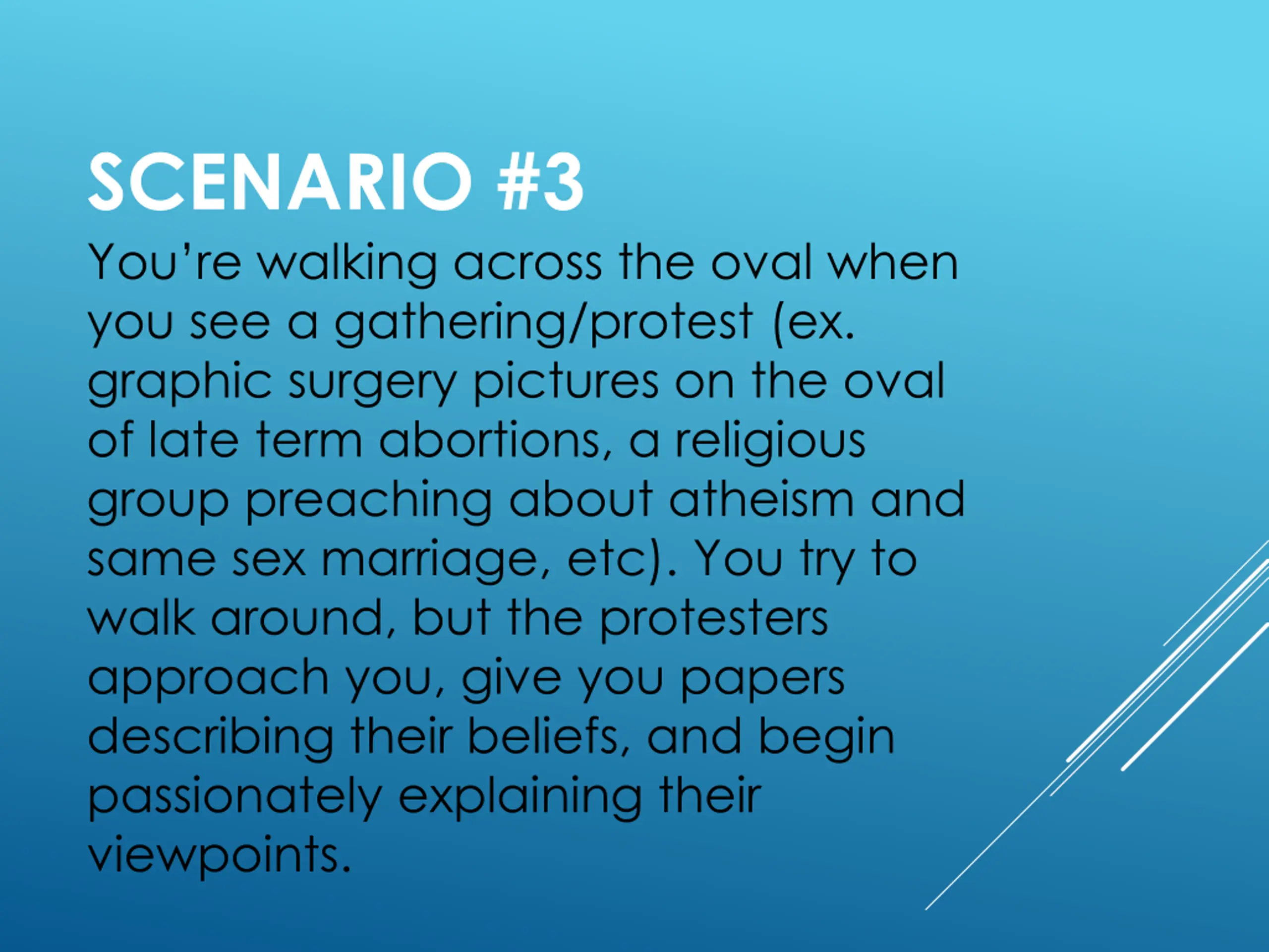 SCENARIO #3 You re walking across the oval when you see a gathering/protest (ex. graphic surgery pictures on the oval of late term abortions, a religious group preaching about atheism and same sex marriage, etc). You try to walk around, but the protesters approach you, give you papers describing their beliefs, and begin passionately explaining their viewpoints.