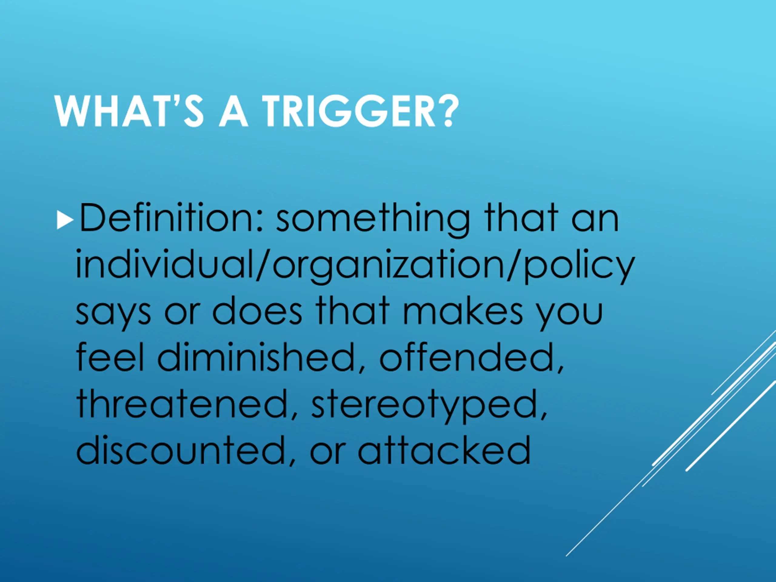 WHATS A TRIGGER? Definition: something that an individual/organization/policy says or does that makes you feel diminished, offended, threatened, stereotyped, discounted, or attacked