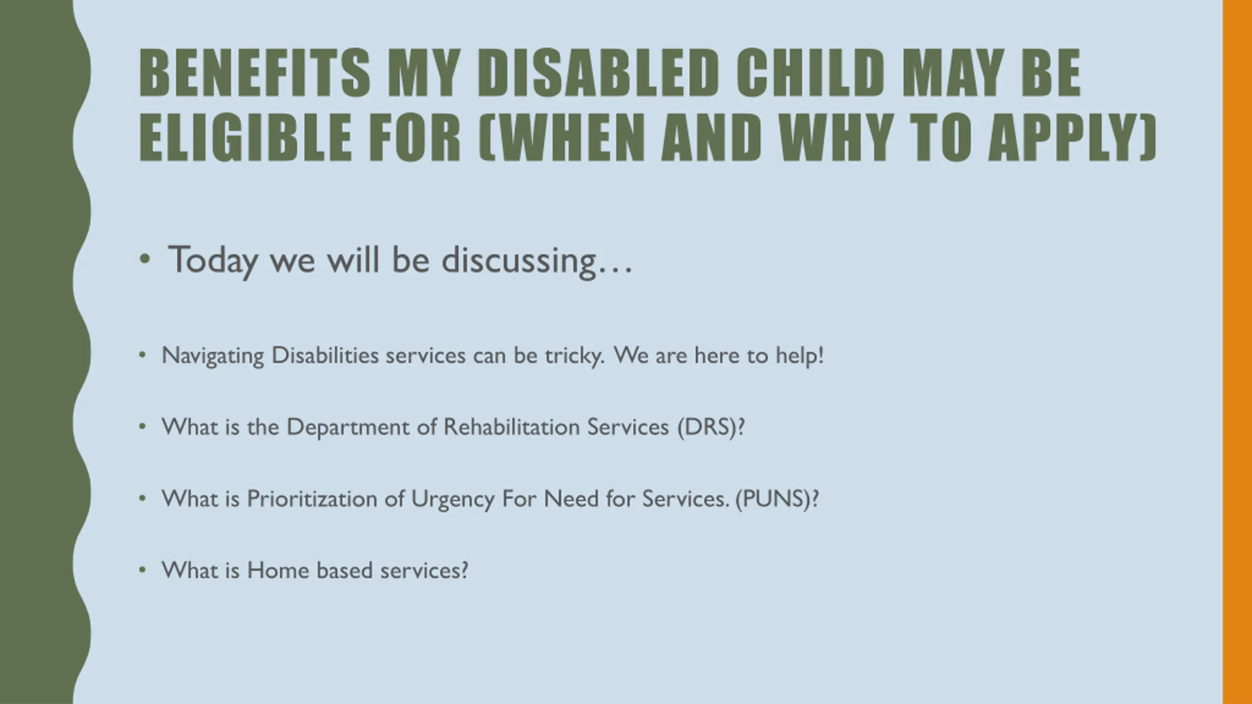 BENEFITS MY DISABLED CHILD MAY BE ELIGIBLE FOR (WHEN AND WHY TO APPLY) Today we will be discussing Navigating Disabilities services can be tricky. We are here to help! What is the Department of Rehabilitation Services (DRS)? What is Prioritization of Urgency For Need for Services. (PUNS)? What is Home based services?