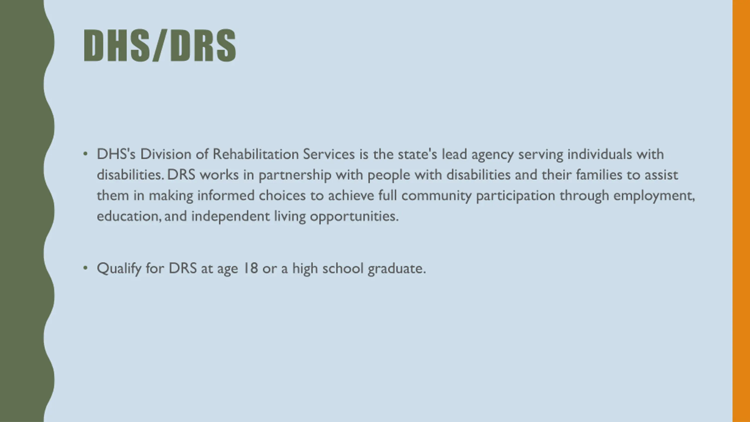 DHS/DRS DHS's Division of Rehabilitation Services is the state's lead agency serving individuals with disabilities. DRS works in partnership with people with disabilities and their families to assist them in making informed choices to achieve full community participation through employment, education, and independent living opportunities. Qualify for DRS at age 18 or a high school graduate.