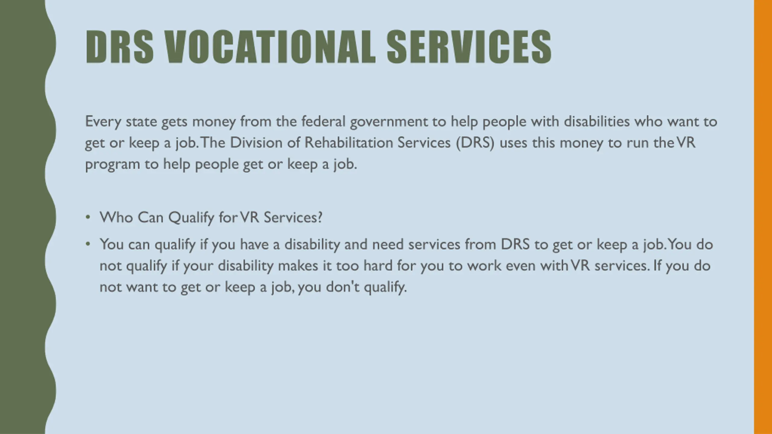 DRS VOCATIONAL SERVICES Every state gets money from the federal government to help people with disabilities who want to get or keep a job. The Division of Rehabilitation Services (DRS) uses this money to run the VR program to help people get or keep a job. Who Can Qualify for VR Services? You can qualify if you have a disability and need services from DRS to get or keep a job. You do not qualify if your disability makes it too hard for you to work even with VR services. If you do not want to get or keep a job, you don't qualify.