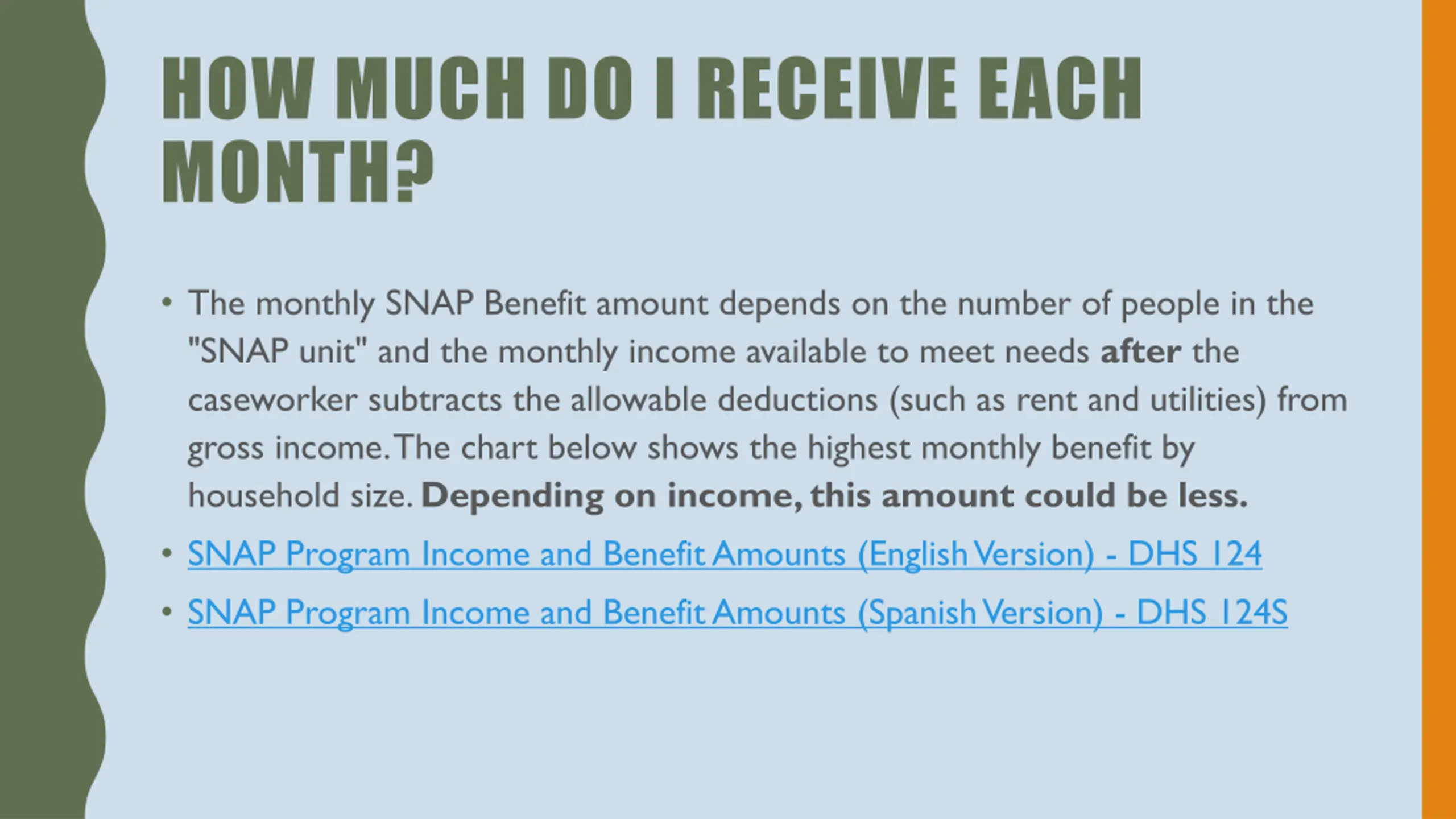 HOW MUCH DO I RECEIVE EACH MONTH? The monthly SNAP Benefit amount depends on the number of people in the "SNAP unit" and the monthly income available to meet needs after the caseworker subtracts the allowable deductions (such as rent and utilities) from gross income. The chart below shows the highest monthly benefit by household size.Depending on income, this amount could be less. SNAP Program Income and Benefit Amounts (English Version) - DHS 124 SNAP Program Income and Benefit Amounts (Spanish Version) - DHS 124S