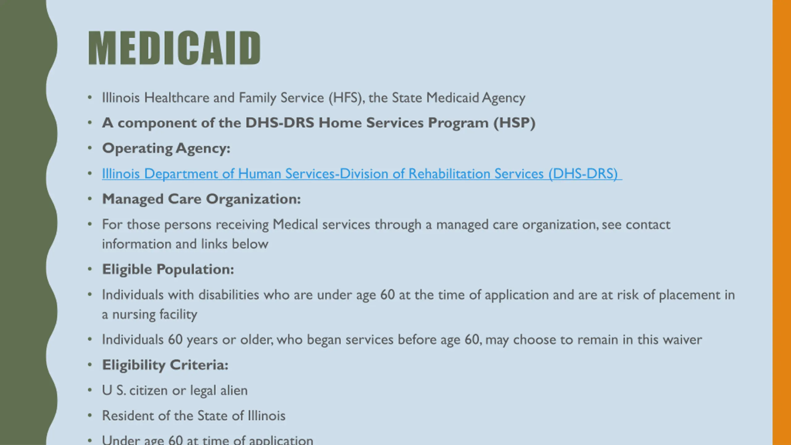 MEDICAID Illinois Healthcare and Family Service (HFS), the State Medicaid Agency A component of the DHS-DRS Home Services Program (HSP) Operating Agency: Illinois Department of Human Services-Division of Rehabilitation Services (DHS-DRS) Managed Care Organization: For those persons receiving Medical services through a managed care organization, see contact information and links below Eligible Population: Individuals with disabilities who are under age 60 at the time of application and are at risk of placement in a nursing facility Individuals 60 years or older, who began services before age 60, may choose to remain in this waiver Eligibility Criteria: U S. citizen or legal alien Resident of the State of Illinois Under age 60 at time of application