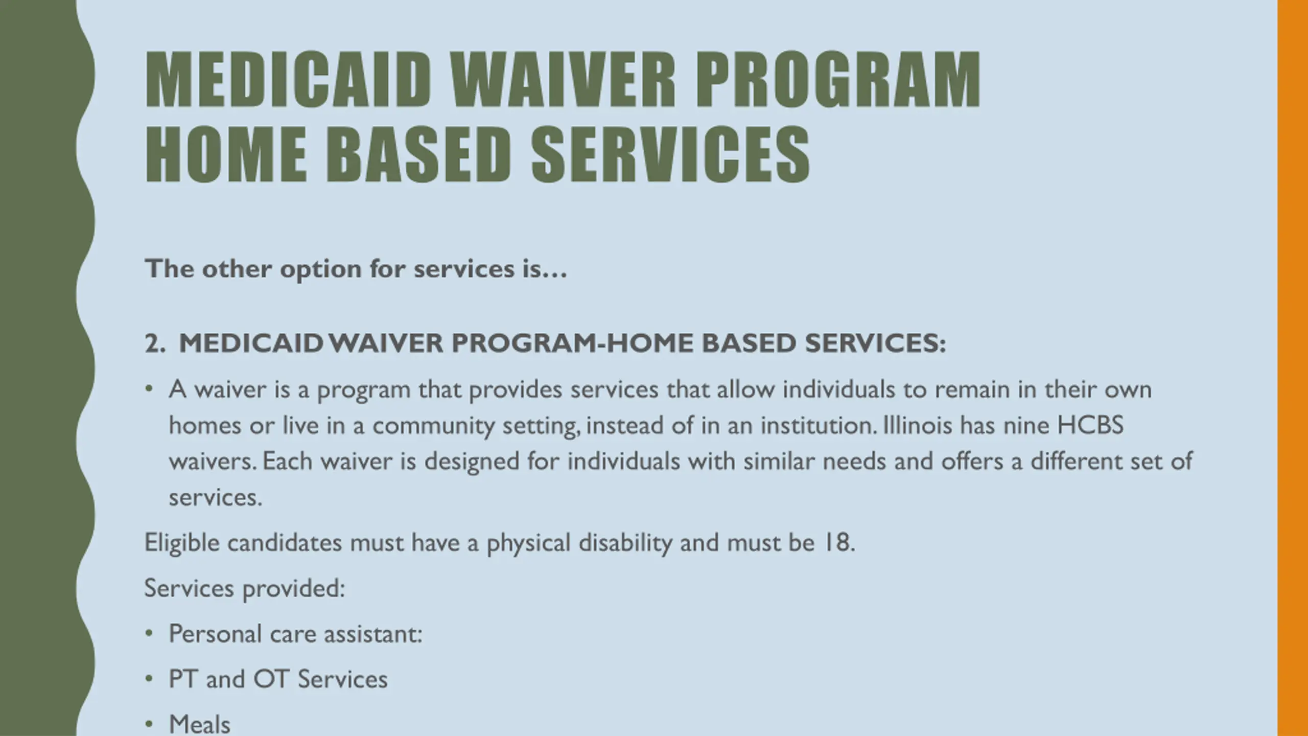 MEDICAID WAIVER PROGRAM HOME BASED SERVICES The other option for services is 2. MEDICAID WAIVER PROGRAM-HOME BASED SERVICES: A waiver is a program that provides services that allow individuals to remain in their own homes or live in a community setting, instead of in an institution. Illinois has nine HCBS waivers. Each waiver is designed for individuals with similar needs and offers a different set of services. Eligible candidates must have a physical disability and must be 18. Services provided: Personal care assistant: PT and OT Services Meals