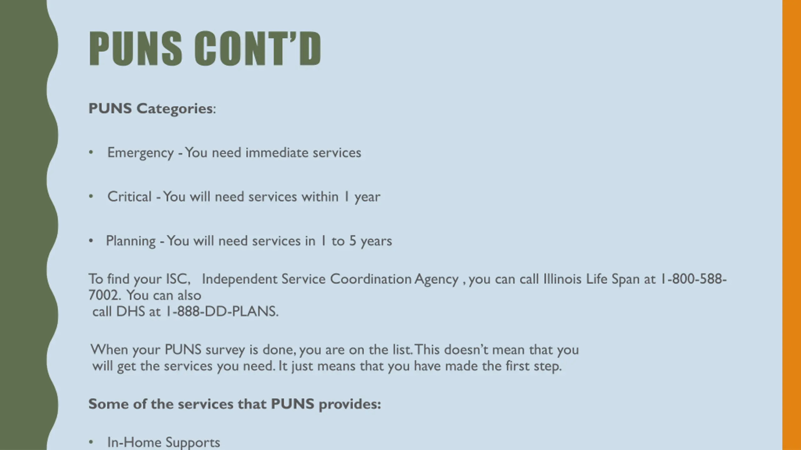 PUNS CONTD PUNS Categories: Emergency - You need immediate services Critical - You will need services within 1 year Planning - You will need services in 1 to 5 years To find your ISC, Independent Service Coordination Agency , you can call Illinois Life Span at 1-800-588- 7002. You can also call DHS at 1-888-DD-PLANS. When your PUNS survey is done, you are on the list. This doesn t mean that you will get the services you need. It just means that you have made the first step. Some of the services that PUNS provides: In-Home Supports