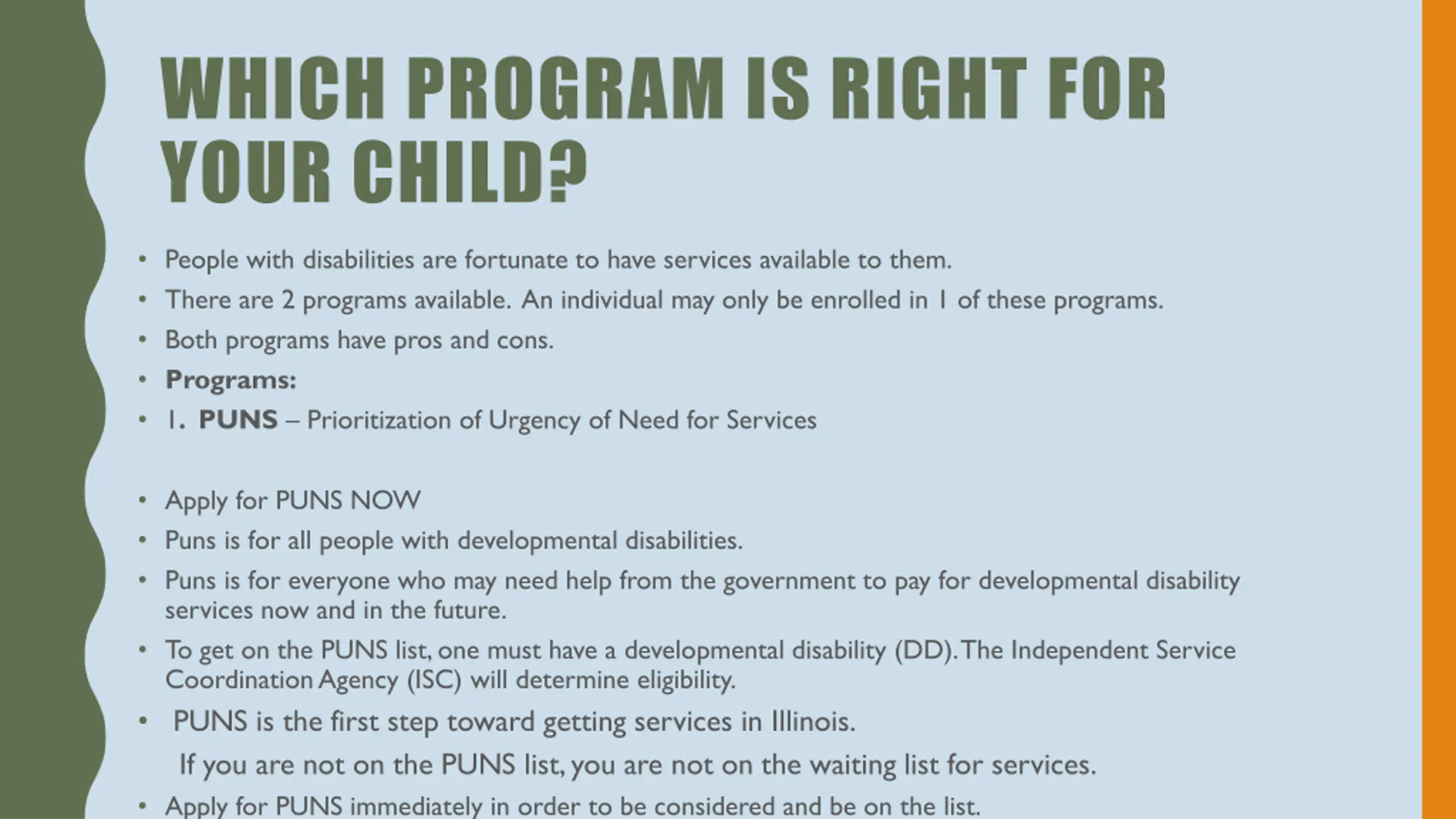 WHICH PROGRAM IS RIGHT FOR YOUR CHILD? People with disabilities are fortunate to have services available to them. There are 2 programs available. An individual may only be enrolled in 1 of these programs. Both programs have pros and cons. Programs: 1. PUNS Prioritization of Urgency of Need for Services Apply for PUNS NOW Puns is for all people with developmental disabilities. Puns is for everyone who may need help from the government to pay for developmental disability services now and in the future. To get on the PUNS list, one must have a developmental disability (DD). The Independent Service Coordination Agency (ISC) will determine eligibility. PUNS is the first step toward getting services in Illinois. If you are not on the PUNS list, you are not on the waiting list for services. Apply for PUNS immediately in order to be considered and be on the list.