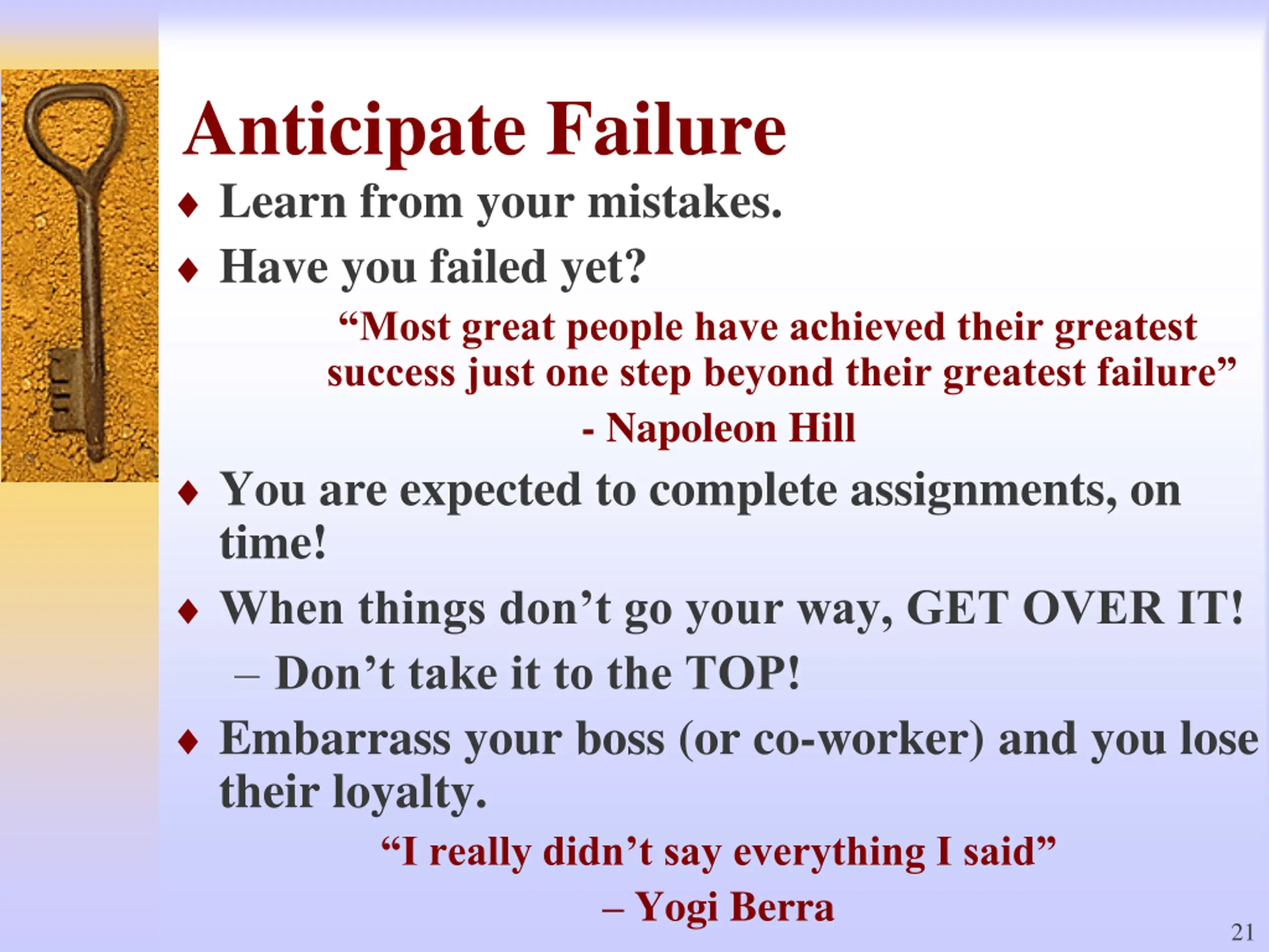 Anticipate Failure Learn from your mistakes. Have you failed yet? Most great people have achieved their greatest success just one step beyond their greatest failure - Napoleon Hill You are expected to complete assignments, on time! When things don t go your way, GET OVER IT! Don t take it to the TOP! Embarrass your boss (or co-worker) and you lose their loyalty. I really didn t say everything I said Yogi Berra 21