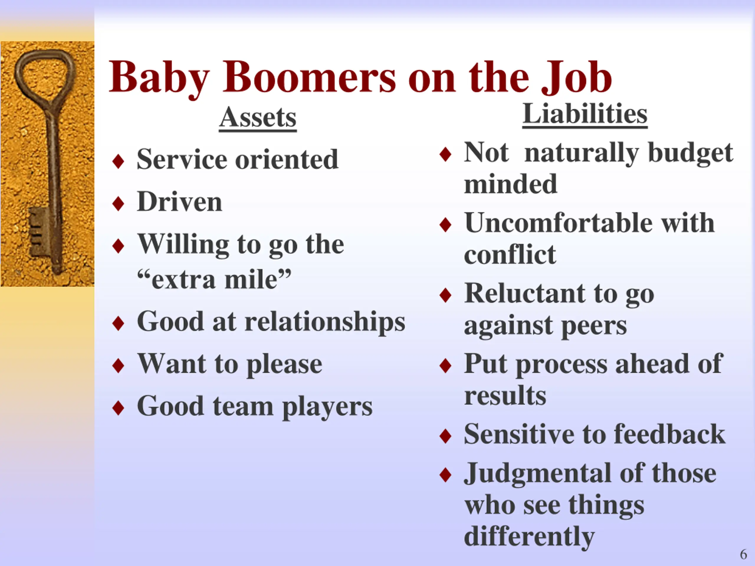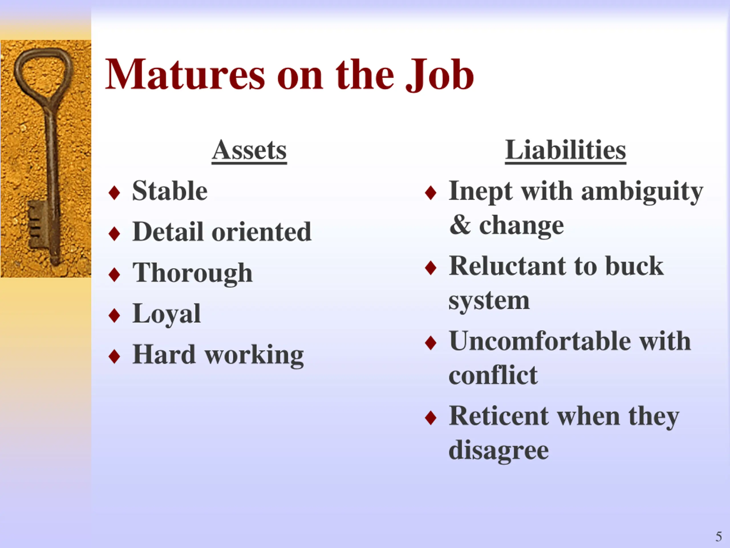 Matures on the Job Assets Liabilities Stable Detail oriented Thorough Loyal Hard working Inept with ambiguity & change Reluctant to buck system Uncomfortable with conflict Reticent when they disagree 5