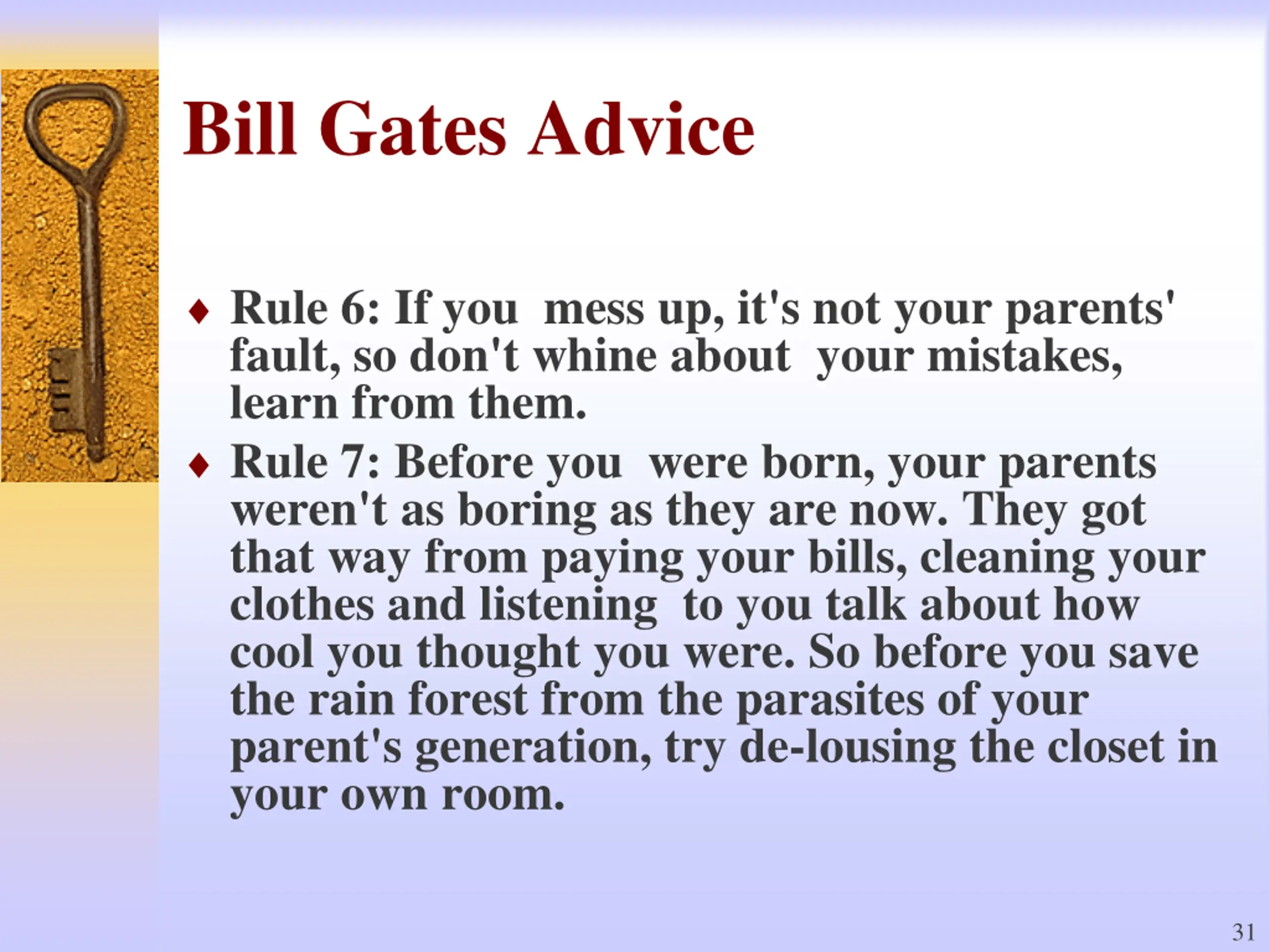 Bill Gates Advice Rule 6: If you mess up, it's not your parents' fault, so don't whine about your mistakes, learn from them. Rule 7: Before you were born, your parents weren't as boring as they are now. They got that way from paying your bills, cleaning your clothes and listening to you talk about how cool you thought you were. So before you save the rain forest from the parasites of your parent's generation, try de-lousing the closet in your own room. 31