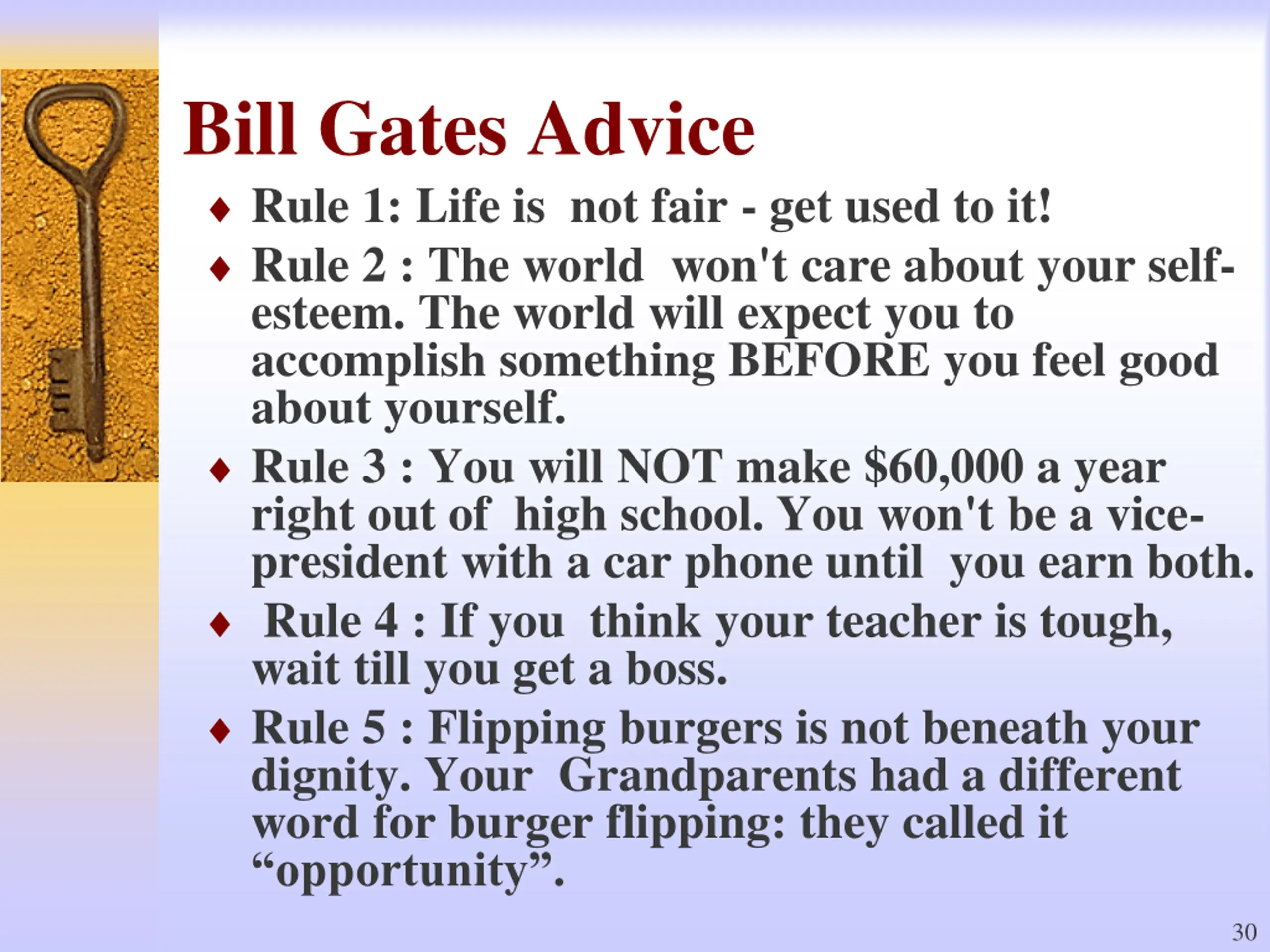 Bill Gates Advice Rule 1: Life is not fair - get used to it! Rule 2 : The world won't care about your self- esteem. The world will expect you to accomplish something BEFORE you feel good about yourself. Rule 3 : You will NOT make $60,000 a year right out of high school. You won't be a vice- president with a car phone until you earn both. Rule 4 : If you think your teacher is tough, wait till you get a boss. Rule 5 : Flipping burgers is not beneath your dignity. Your Grandparents had a different word for burger flipping: they called it opportunity . 30