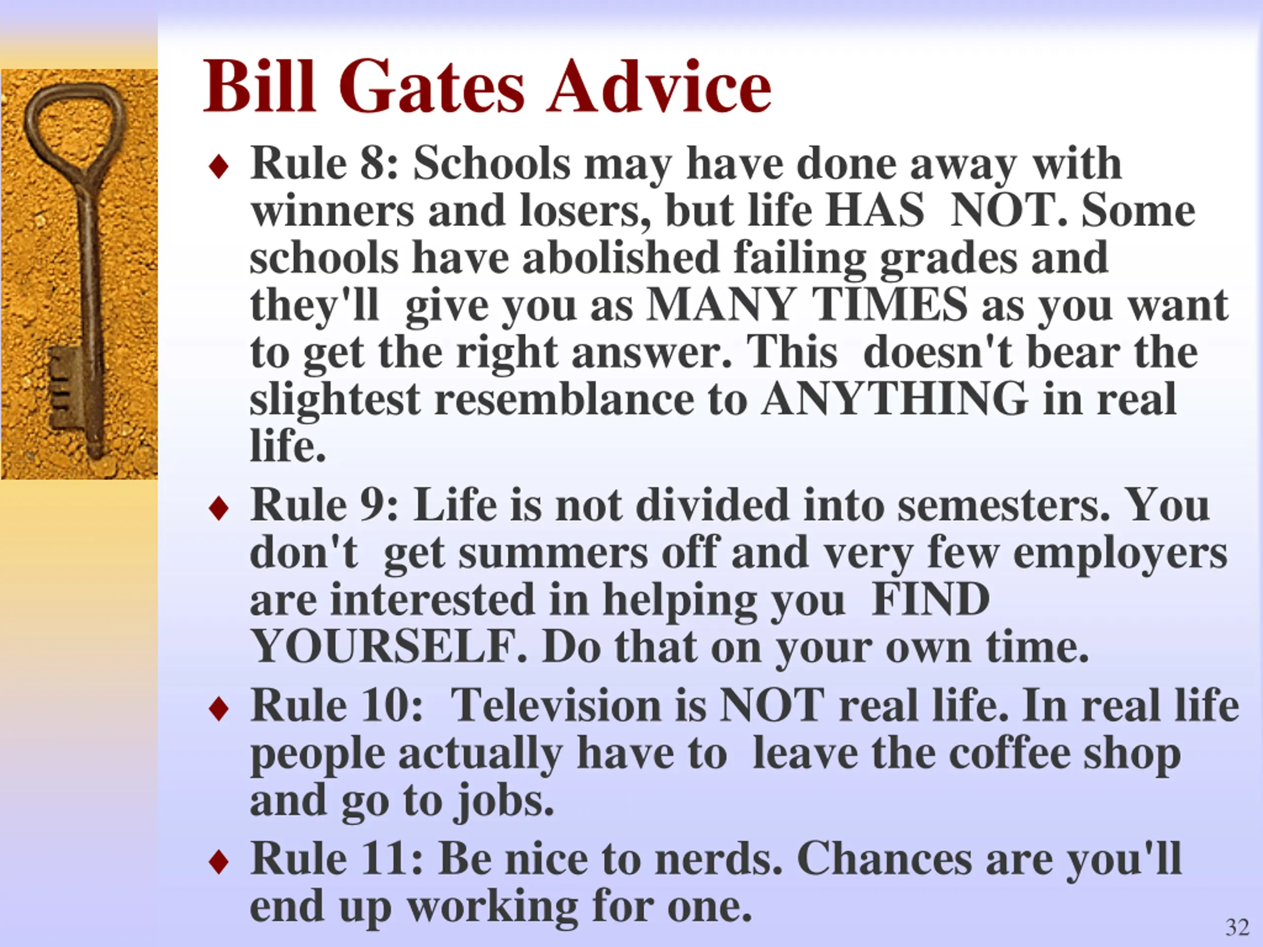 Bill Gates Advice Rule 8: Schools may have done away with winners and losers, but life HAS NOT. Some schools have abolished failing grades and they'll give you as MANY TIMES as you want to get the right answer. This doesn't bear the slightest resemblance to ANYTHING in real life. Rule 9: Life is not divided into semesters. You don't get summers off and very few employers are interested in helping you FIND YOURSELF. Do that on your own time. Rule 10: Television is NOT real life. In real life people actually have to leave the coffee shop and go to jobs. Rule 11: Be nice to nerds. Chances are you'll end up working for one. 32