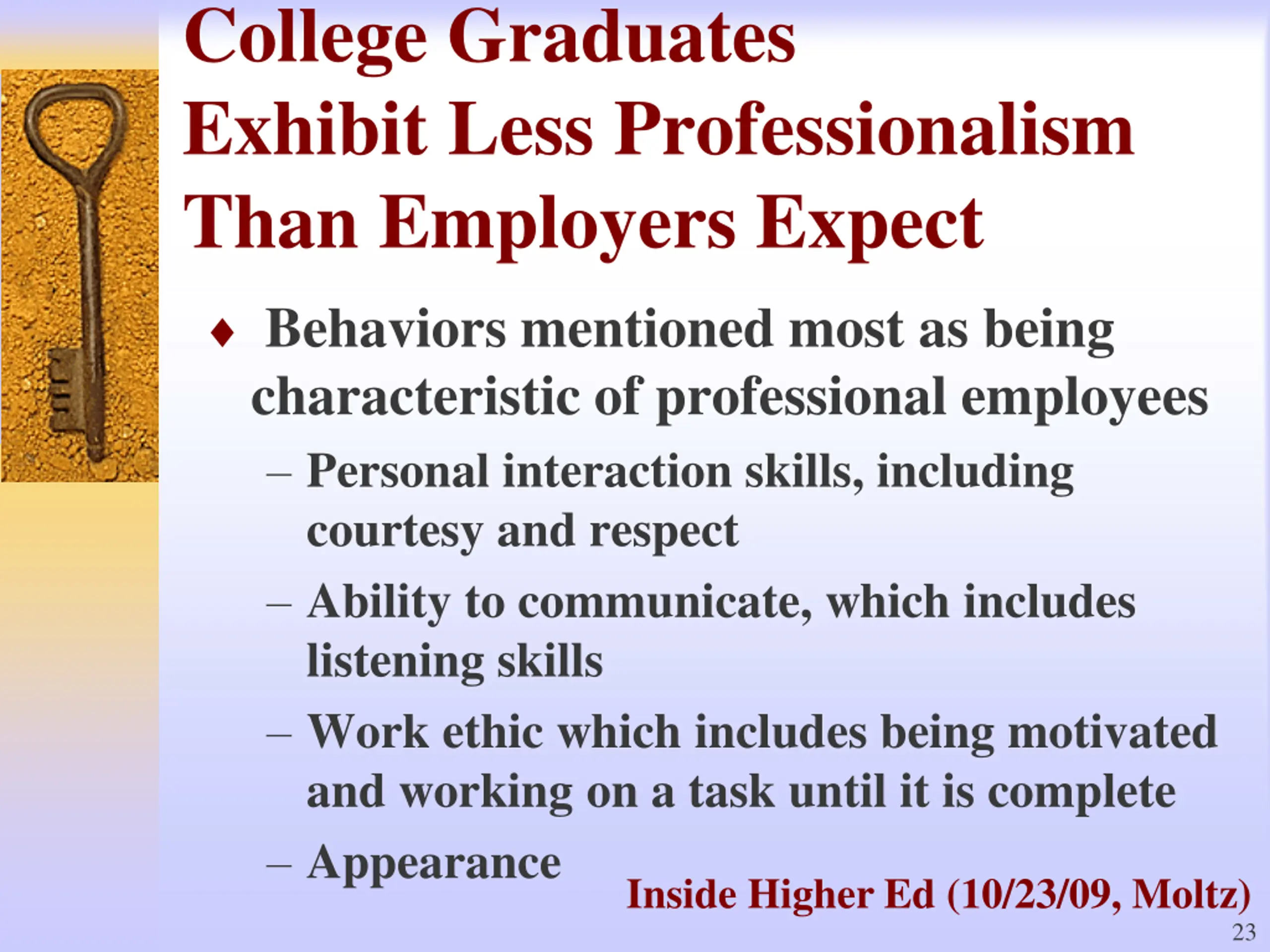 College Graduates Exhibit Less Professionalism Than Employers Expect Behaviors mentioned most as being characteristic of professional employees Personal interaction skills, including courtesy and respect Ability to communicate, which includes listening skills Work ethic which includes being motivated and working on a task until it is complete Appearance Inside Higher Ed (10/23/09, Moltz) 23
