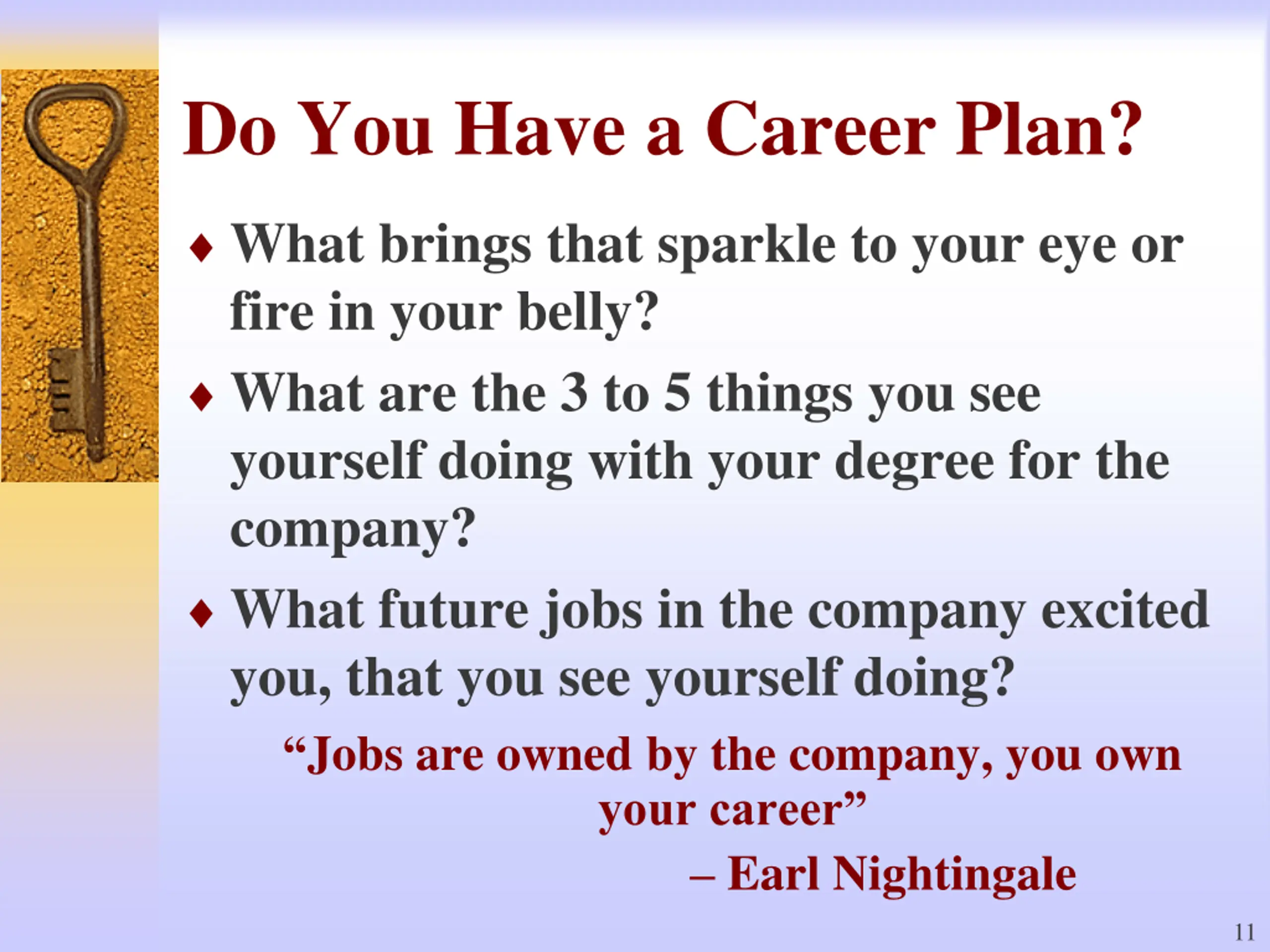 Do You Have a Career Plan? What brings that sparkle to your eye or fire in your belly? What are the 3 to 5 things you see yourself doing with your degree for the company? What future jobs in the company excited you, that you see yourself doing? Jobs are owned by the company, you own your career Earl Nightingale 11