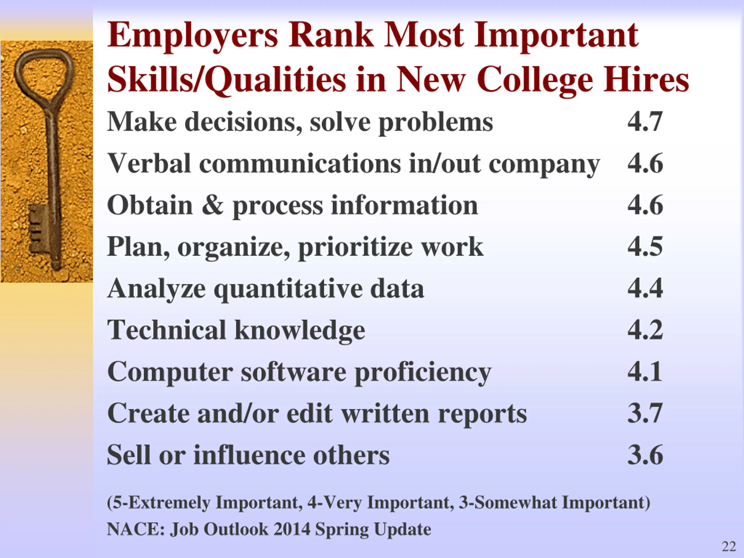 Employers Rank Most Important Skills/Qualities in New College Hires Make decisions, solve problems Verbal communications in/out company 4.6 Obtain & process information Plan, organize, prioritize work Analyze quantitative data Technical knowledge Computer software proficiency Create and/or edit written reports Sell or influence others 4.7 4.6 4.5 4.4 4.2 4.1 3.7 3.6 (5-Extremely Important, 4-Very Important, 3-Somewhat Important) NACE: Job Outlook 2014 Spring Update 22