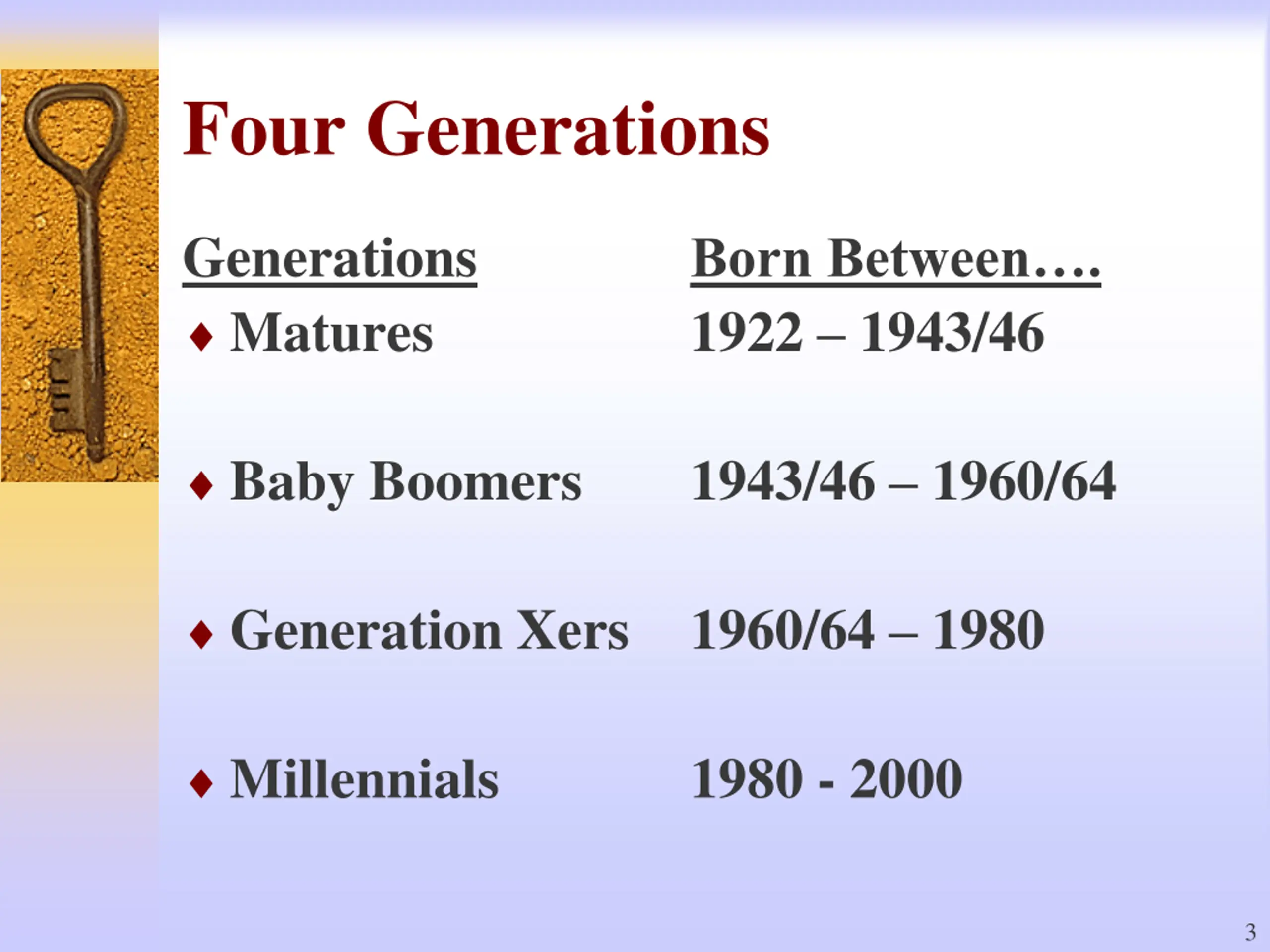 Four Generations Generations Matures Born Between . 1922 1943/46 Baby Boomers 1943/46 1960/64 Generation Xers 1960/64 1980 Millennials 1980 - 2000 3