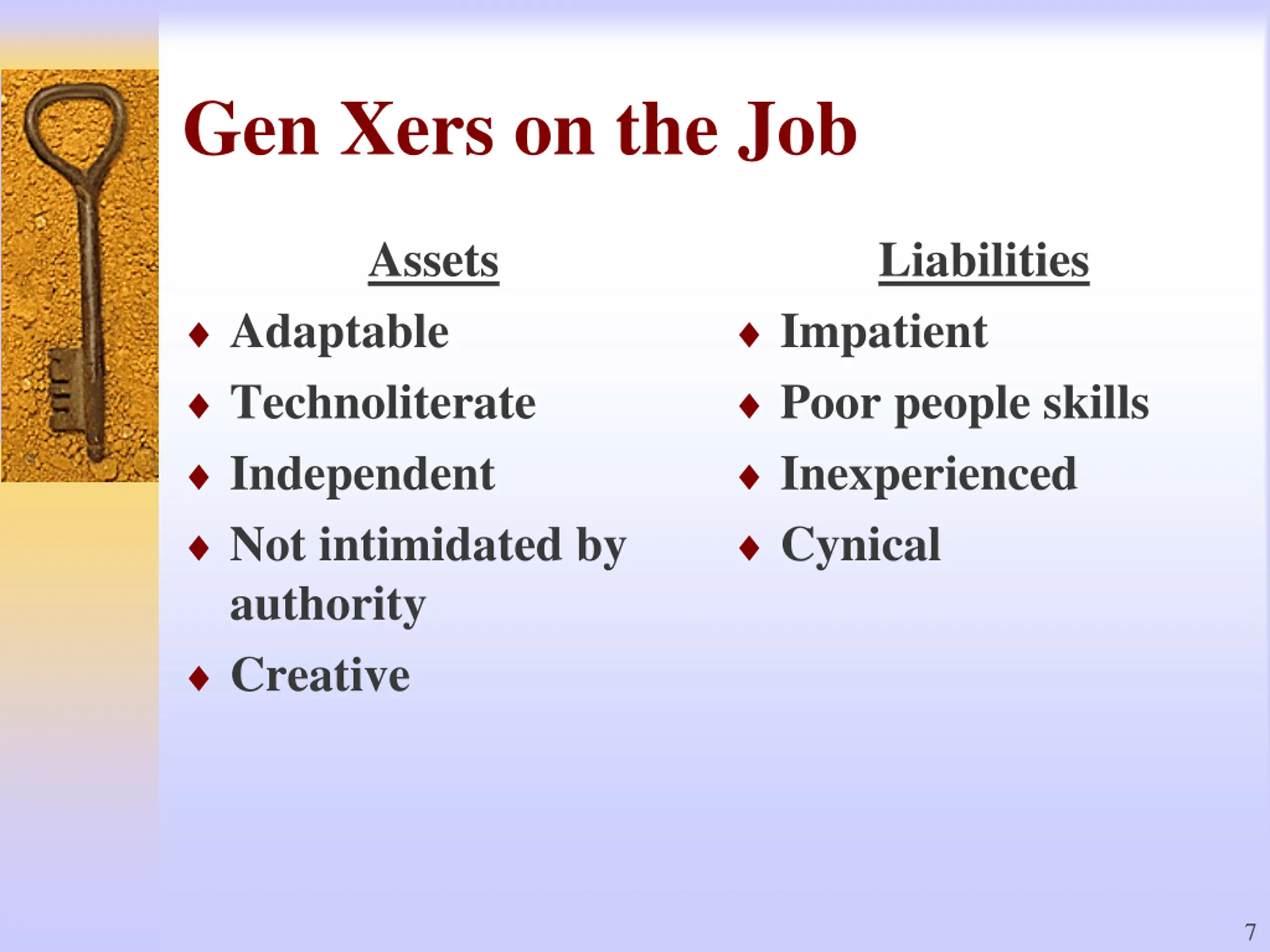 Baby Boomers on the Job Assets Service oriented Driven Willing to go the extra mile Good at relationships Want to please Good team players Liabilities Not naturally budget minded Uncomfortable with conflict Reluctant to go against peers Put process ahead of results Sensitive to feedback Judgmental of those who see things differently 6