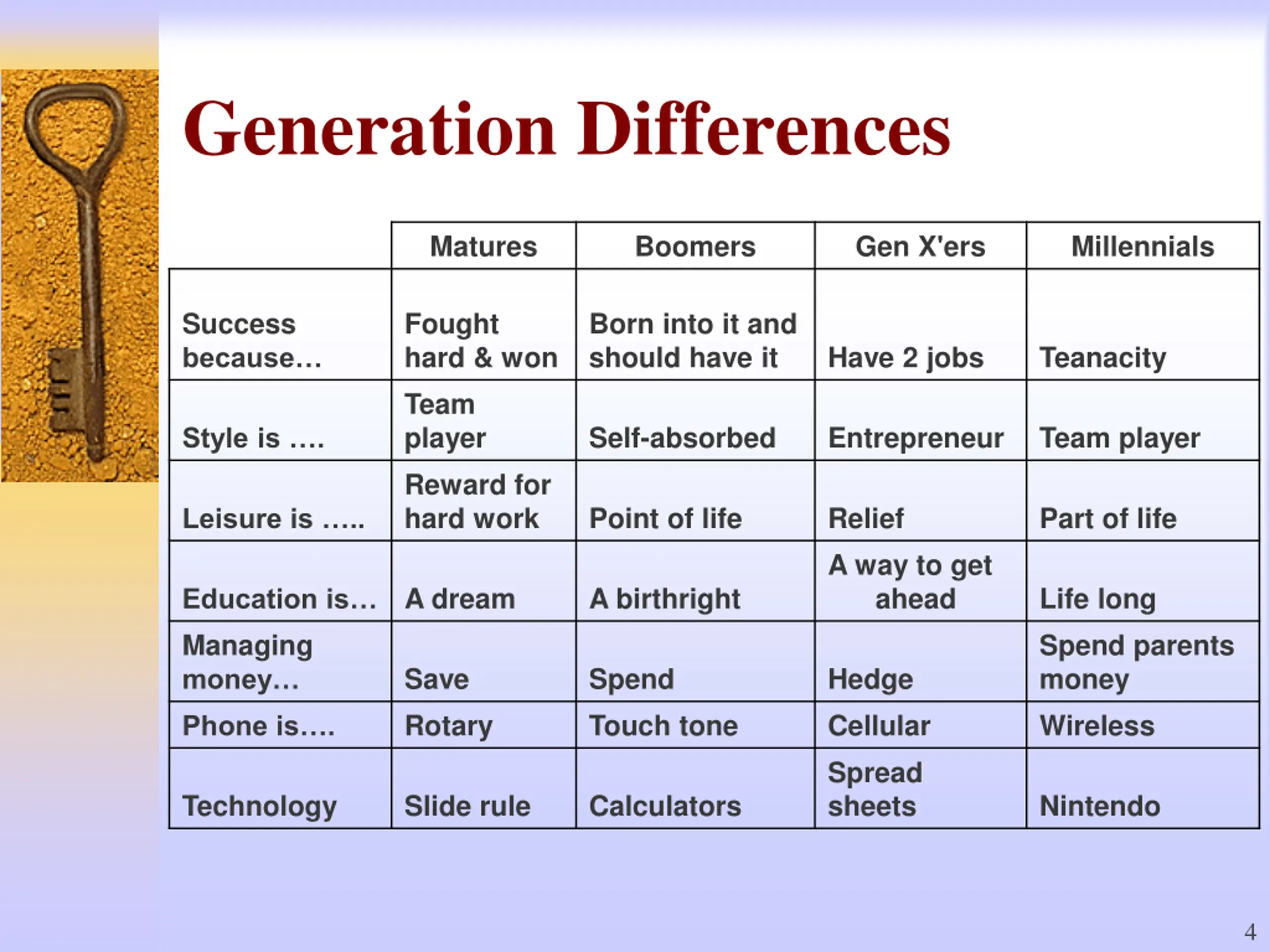 Generation Differences Matures Boomers Gen X'ers Millennials Success because Fought hard & won Team player Reward for hard work Born into it and should have it Have 2 jobs Teanacity Self-absorbed Entrepreneur Team player Style is . Point of life Relief A way to get ahead Part of life Leisure is .. A dream A birthright Life long Spend parents money Wireless Education is Managing money Save Rotary Spend Touch tone Hedge Cellular Spread sheets Phone is . Technology Slide rule Calculators Nintendo 4