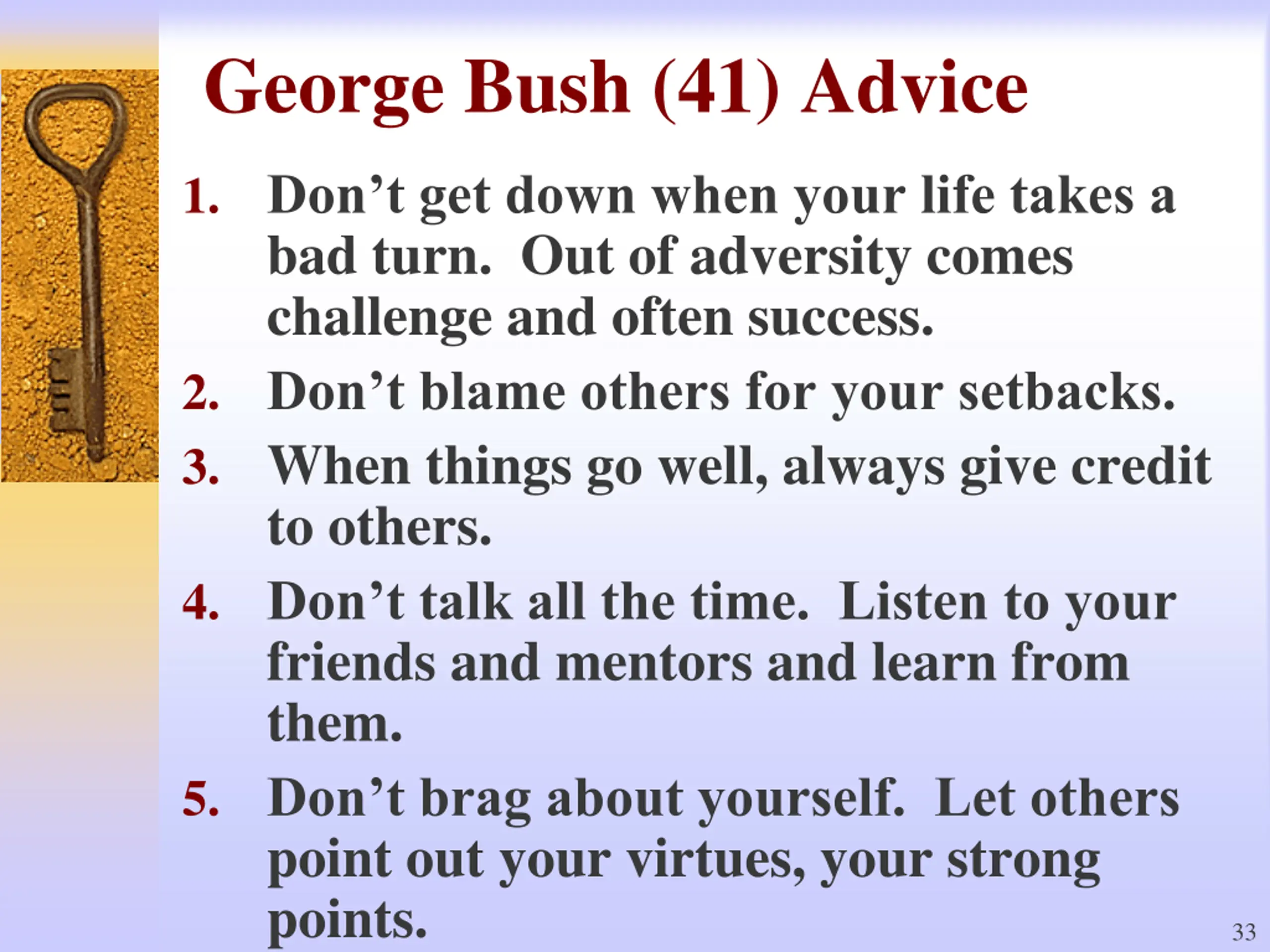 George Bush (41) Advice 1. Don t get down when your life takes a bad turn. Out of adversity comes challenge and often success. 2. Don t blame others for your setbacks. 3. When things go well, always give credit to others. 4. Don t talk all the time. Listen to your friends and mentors and learn from them. 5. Don t brag about yourself. Let others point out your virtues, your strong points. 33