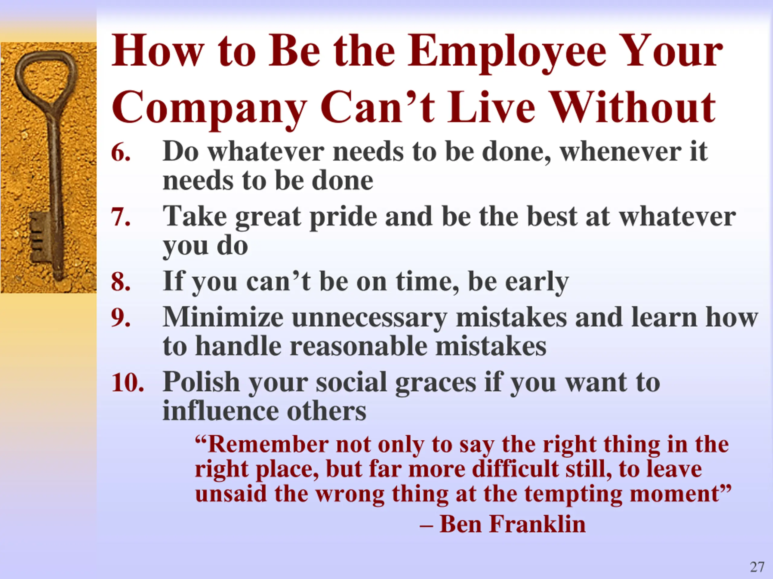 How to Be the Employee Your Company Can t Live Without 6. Do whatever needs to be done, whenever it needs to be done 7. Take great pride and be the best at whatever you do 8. If you can t be on time, be early 9. Minimize unnecessary mistakes and learn how to handle reasonable mistakes 10. Polish your social graces if you want to influence others Remember not only to say the right thing in the right place, but far more difficult still, to leave unsaid the wrong thing at the tempting moment Ben Franklin 27