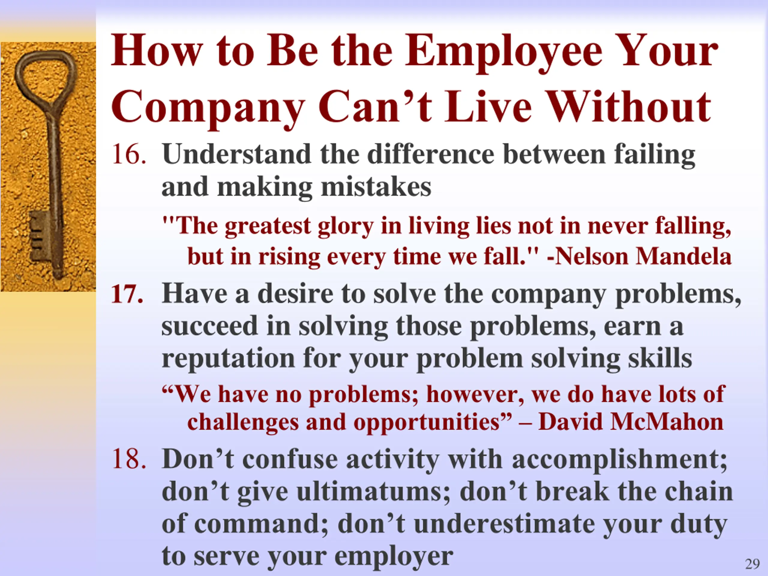 How to Be the Employee Your Company Can t Live Without 16.Understand the difference between failing and making mistakes "The greatest glory in living lies not in never falling, but in rising every time we fall." -Nelson Mandela 17. Have a desire to solve the company problems, succeed in solving those problems, earn a reputation for your problem solving skills We have no problems; however, we do have lots of challenges and opportunities David McMahon 18.Don t confuse activity with accomplishment; don t give ultimatums; don t break the chain of command; don t underestimate your duty to serve your employer 29