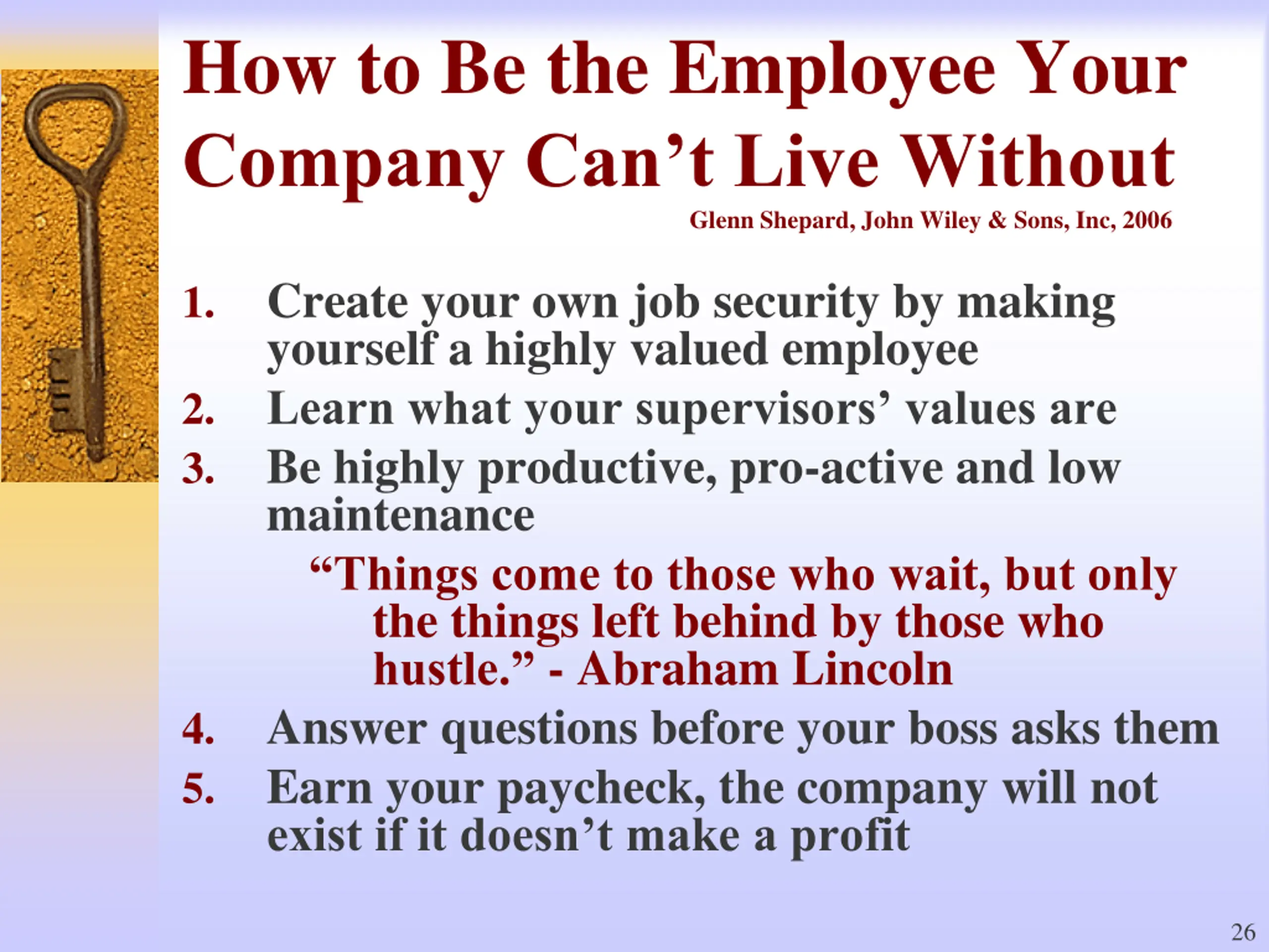 How to Be the Employee Your Company Can t Live Without Glenn Shepard, John Wiley & Sons, Inc, 2006 Create your own job security by making yourself a highly valued employee Learn what your supervisors values are Be highly productive, pro-active and low maintenance Things come to those who wait, but only the things left behind by those who hustle. - Abraham Lincoln Answer questions before your boss asks them Earn your paycheck, the company will not exist if it doesn t make a profit 1. 2. 3. 4. 5. 26