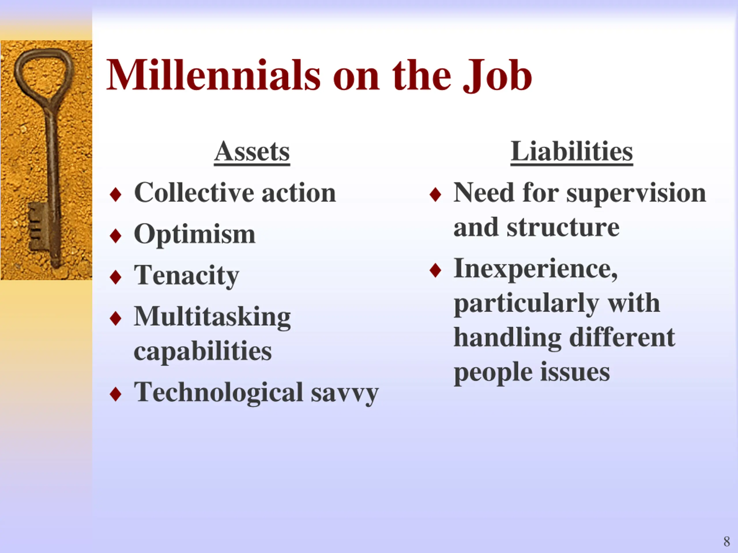 Gen Xers on the Job Assets Liabilities Adaptable Technoliterate Independent Not intimidated by authority Creative Impatient Poor people skills Inexperienced Cynical 7