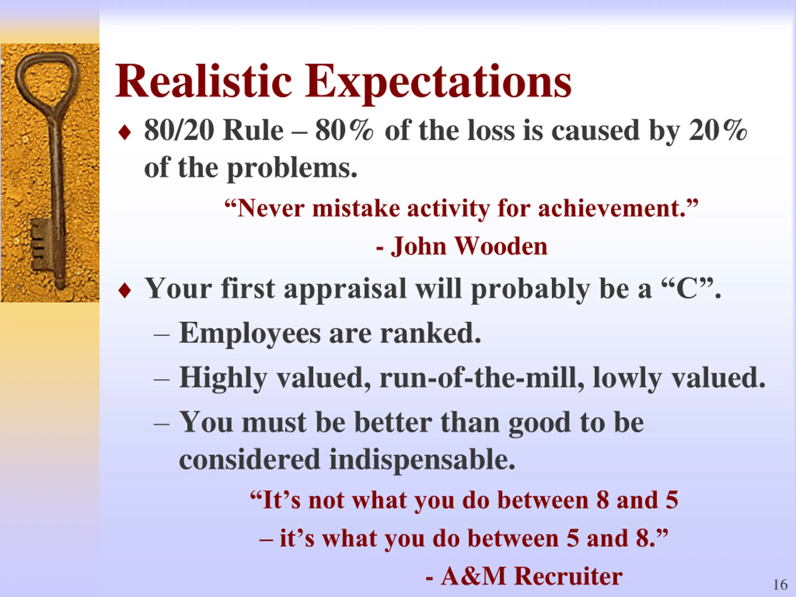 Realistic Expectations 80/20 Rule 80% of the loss is caused by 20% of the problems. Never mistake activity for achievement. - John Wooden Your first appraisal will probably be a C . Employees are ranked. Highly valued, run-of-the-mill, lowly valued. You must be better than good to be considered indispensable. It s not what you do between 8 and 5 it s what you do between 5 and 8. - A&M Recruiter 16