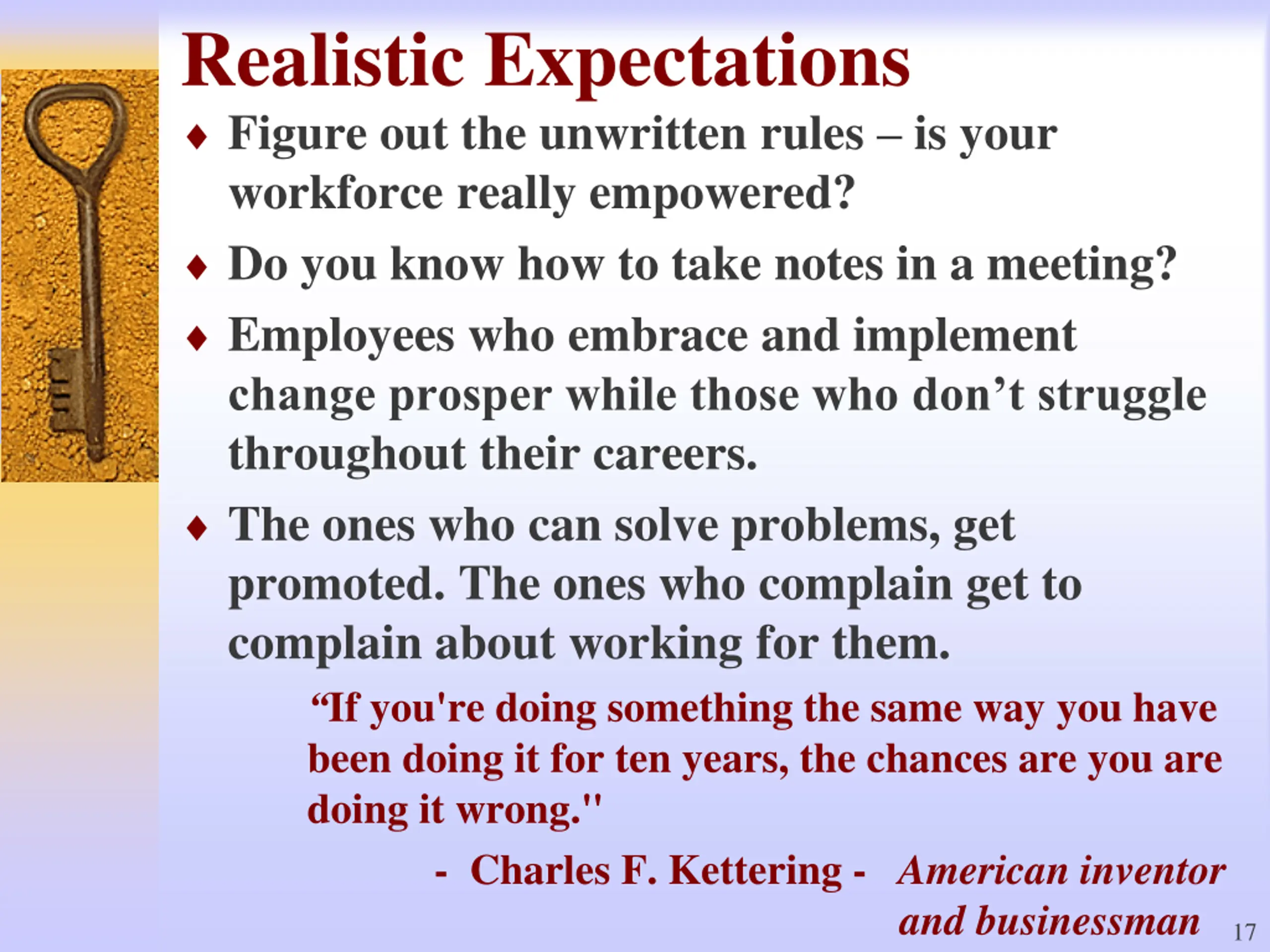 Realistic Expectations Figure out the unwritten rules is your workforce really empowered? Do you know how to take notes in a meeting? Employees who embrace and implement change prosper while those who don t struggle throughout their careers. The ones who can solve problems, get promoted. The ones who complain get to complain about working for them. If you're doing something the same way you have been doing it for ten years, the chances are you are doing it wrong." - Charles F. Kettering - American inventor and businessman 17