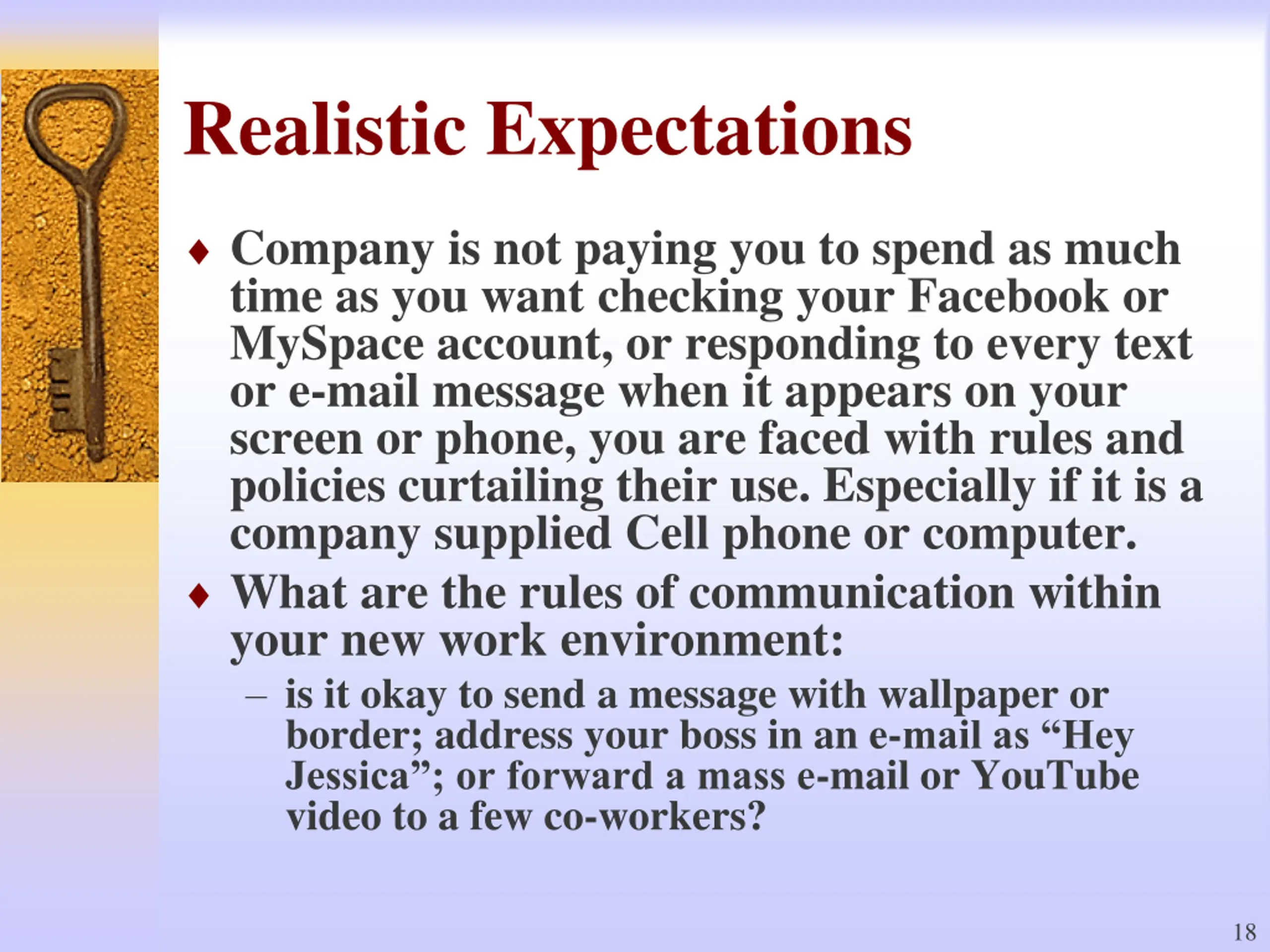 Realistic Expectations Company is not paying you to spend as much time as you want checking your Facebook or MySpace account, or responding to every text or e-mail message when it appears on your screen or phone, you are faced with rules and policies curtailing their use. Especially if it is a company supplied Cell phone or computer. What are the rules of communication within your new work environment: is it okay to send a message with wallpaper or border; address your boss in an e-mail as Hey Jessica ; or forward a mass e-mail or YouTube video to a few co-workers? 18