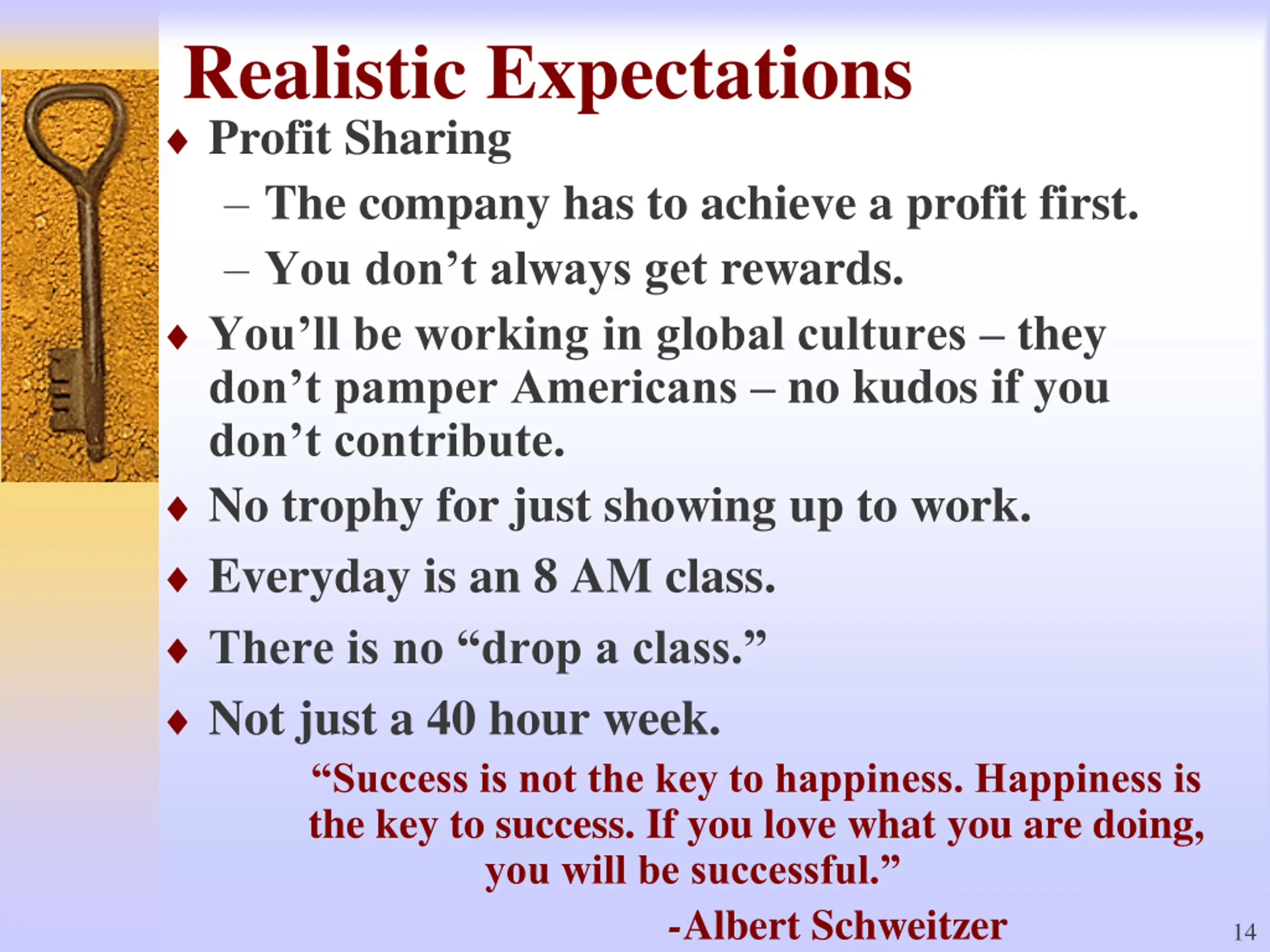 Realistic Expectations Profit Sharing The company has to achieve a profit first. You don t always get rewards. You ll be working in global cultures they don t pamper Americans no kudos if you don t contribute. No trophy for just showing up to work. Everyday is an 8 AM class. There is no drop a class. Not just a 40 hour week. Success is not the key to happiness. Happiness is the key to success. If you love what you are doing, you will be successful. -Albert Schweitzer 14