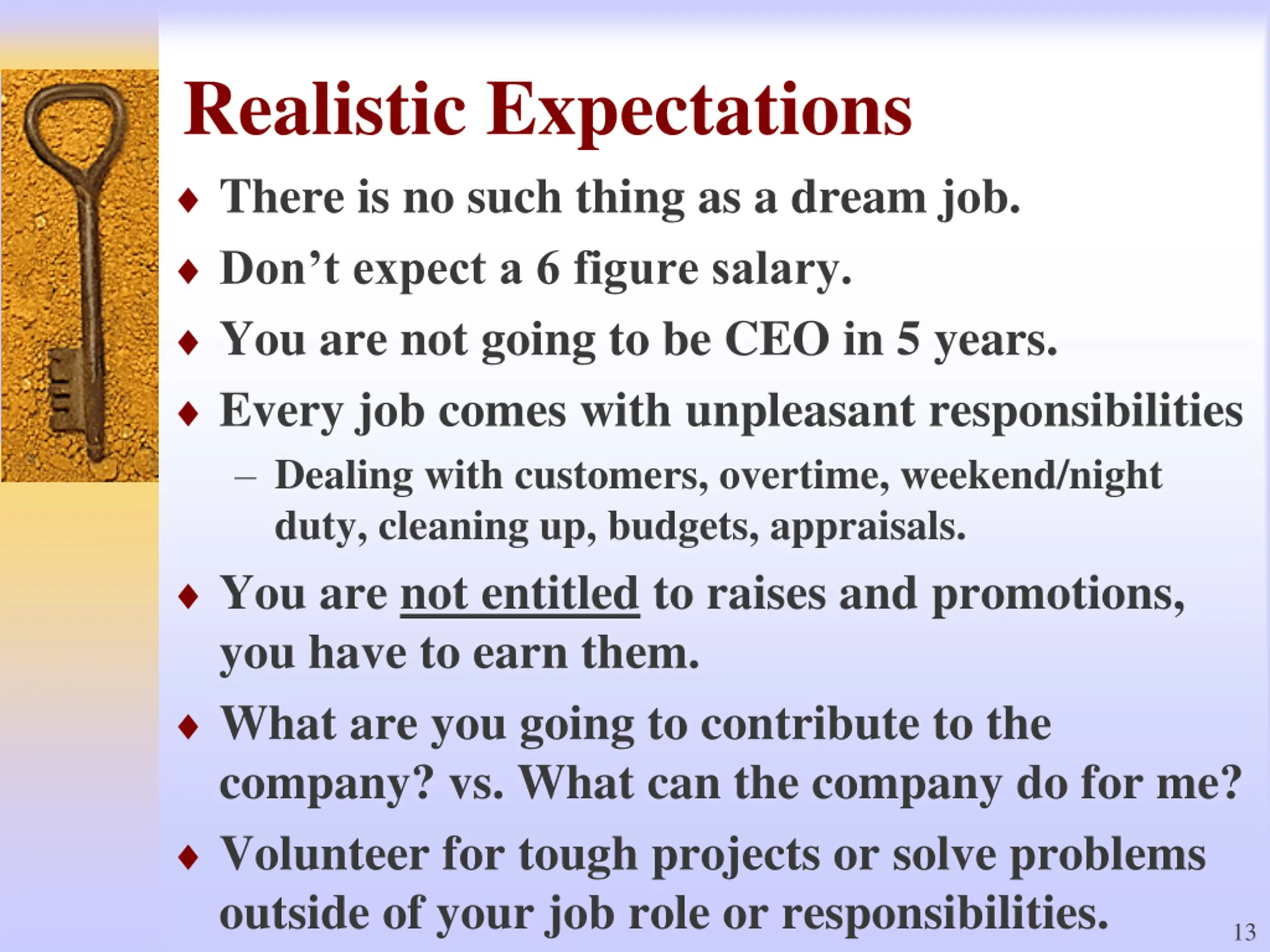 Realistic Expectations There is no such thing as a dream job. Don t expect a 6 figure salary. You are not going to be CEO in 5 years. Every job comes with unpleasant responsibilities Dealing with customers, overtime, weekend/night duty, cleaning up, budgets, appraisals. You are not entitled to raises and promotions, you have to earn them. What are you going to contribute to the company? vs. What can the company do for me? Volunteer for tough projects or solve problems outside of your job role or responsibilities. 13