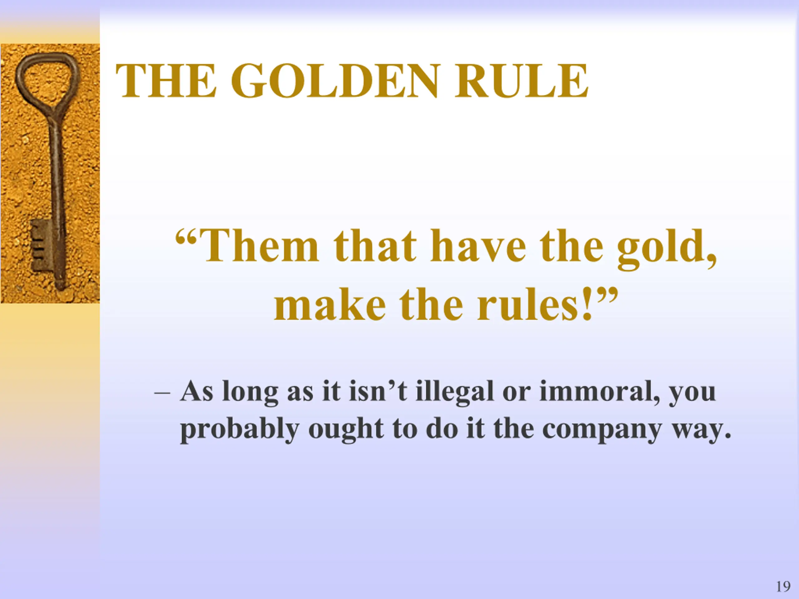 THE GOLDEN RULE Them that have the gold, make the rules! As long as it isn t illegal or immoral, you probably ought to do it the company way. 19