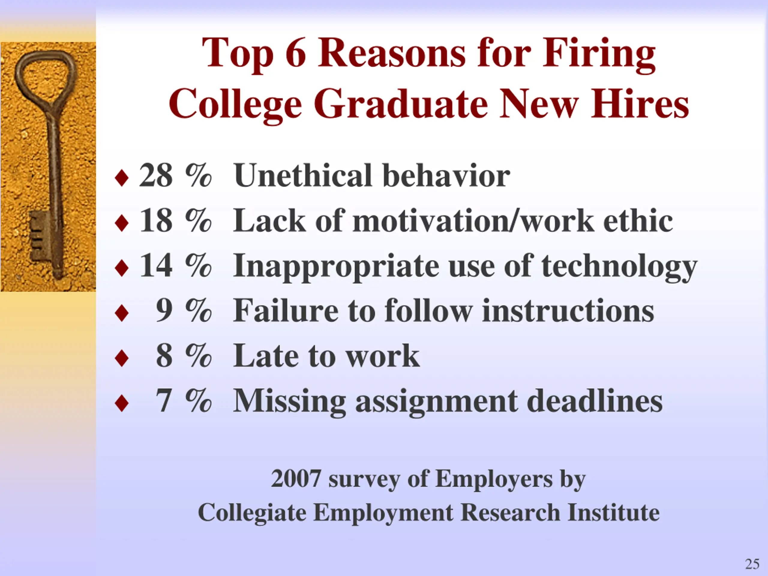 Top 6 Reasons for Firing College Graduate New Hires 28 % Unethical behavior 18 % Lack of motivation/work ethic 14 % Inappropriate use of technology 9 % Failure to follow instructions 8 % Late to work 7 % Missing assignment deadlines 2007 survey of Employers by Collegiate Employment Research Institute 25