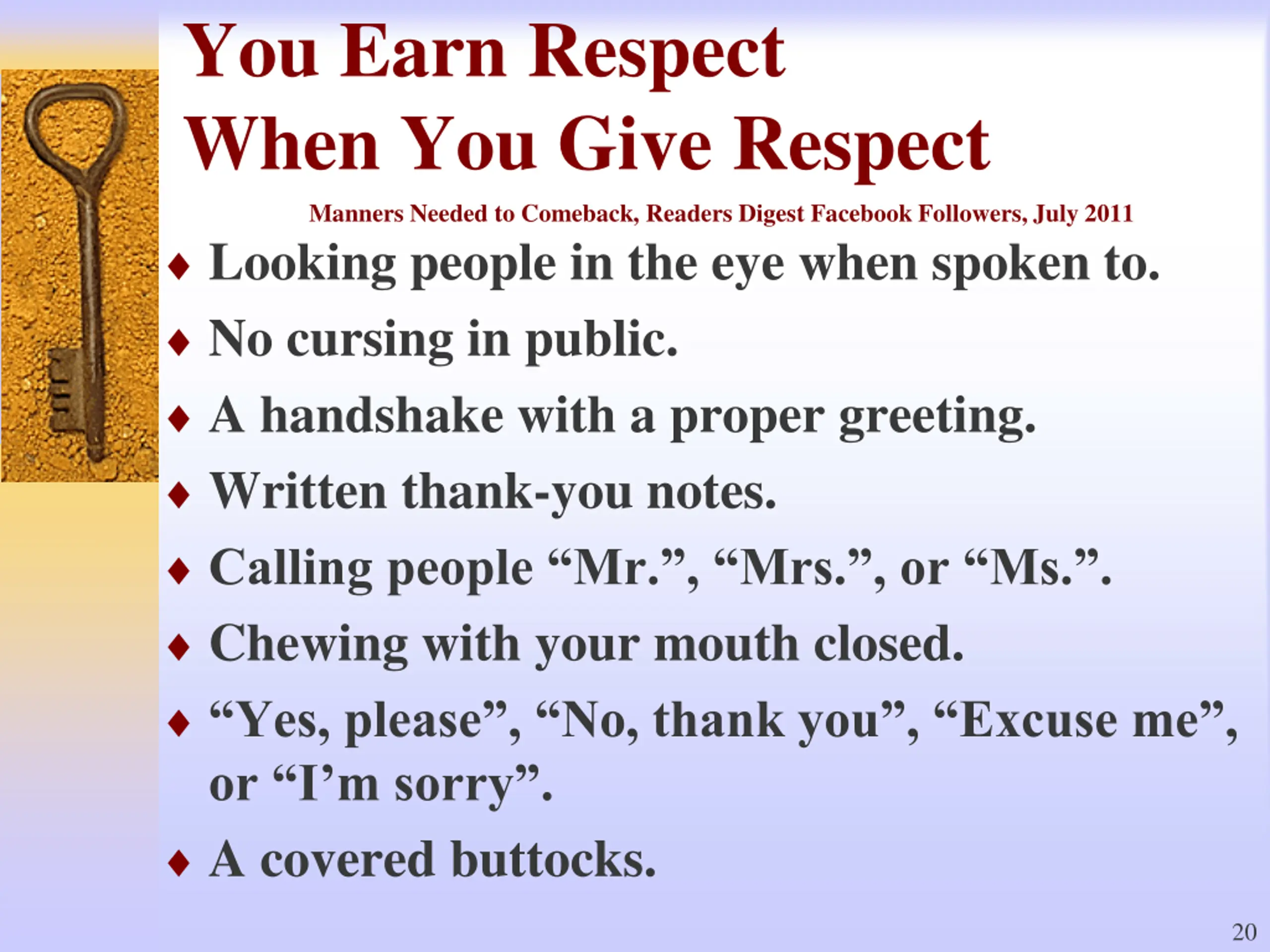 You Earn Respect When You Give Respect Manners Needed to Comeback, Readers Digest Facebook Followers, July 2011 Looking people in the eye when spoken to. No cursing in public. A handshake with a proper greeting. Written thank-you notes. Calling people Mr. , Mrs. , or Ms. . Chewing with your mouth closed. Yes, please , No, thank you , Excuse me , or I m sorry . A covered buttocks. 20