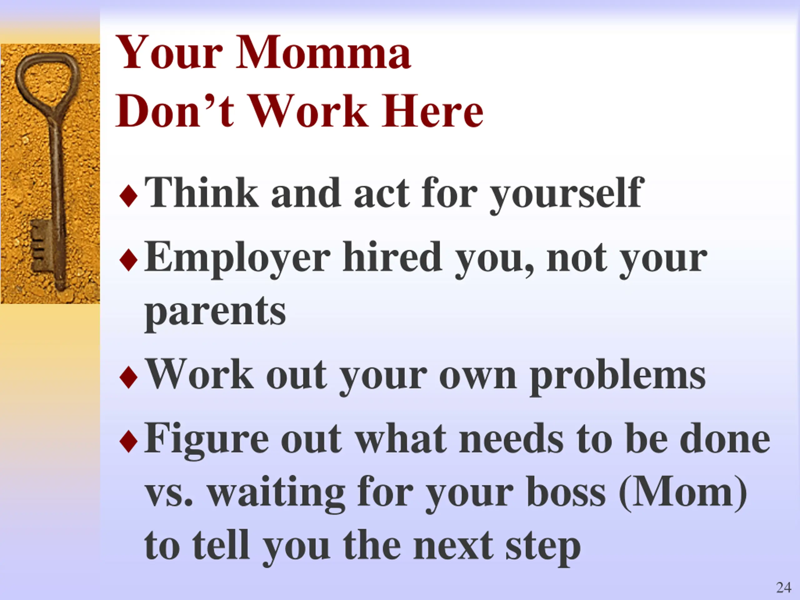 Your Momma Don t Work Here Think and act for yourself Employer hired you, not your parents Work out your own problems Figure out what needs to be done vs. waiting for your boss (Mom) to tell you the next step 24