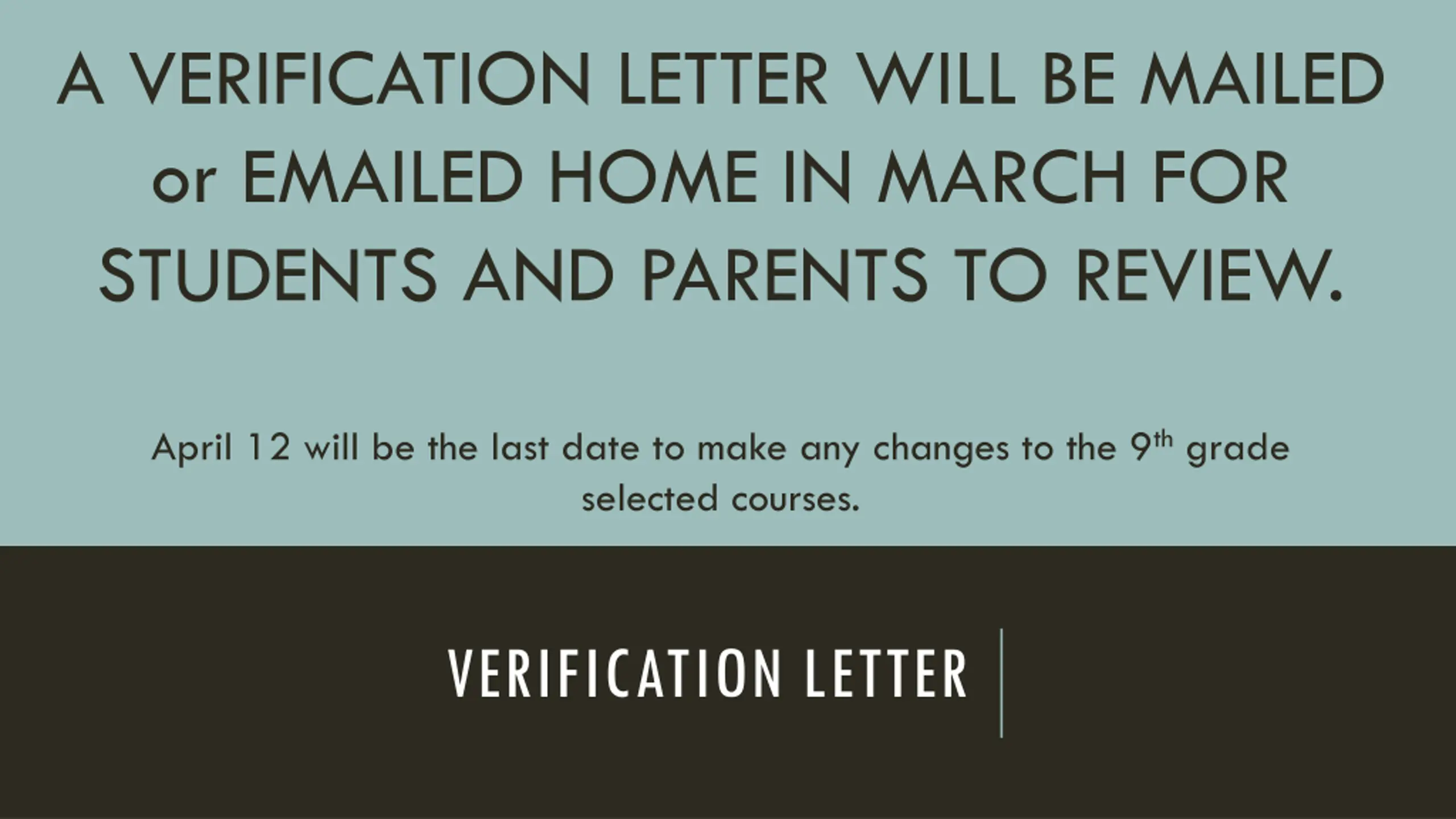 A VERIFICATION LETTER WILL BE MAILED or EMAILED HOME IN MARCH FOR STUDENTS AND PARENTS TO REVIEW. April 12 will be the last date to make any changes to the 9th grade selected courses. VERIFICATION LETTER