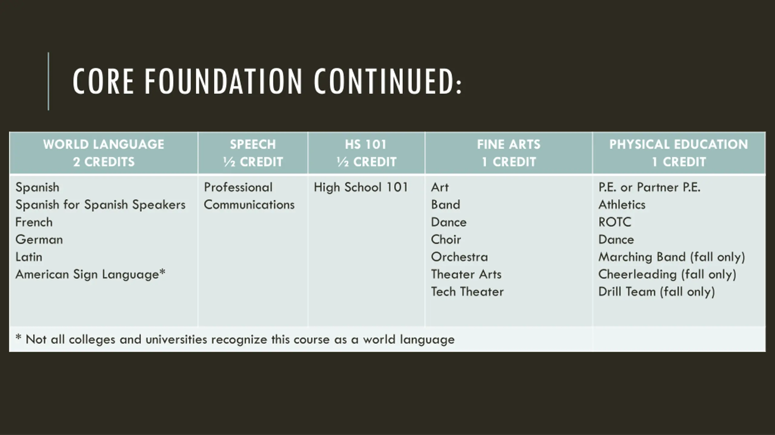 CORE FOUNDATION CONTINUED: WORLD LANGUAGE 2 CREDITS SPEECH CREDIT HS 101 CREDIT FINE ARTS 1 CREDIT PHYSICAL EDUCATION 1 CREDIT Spanish Spanish for Spanish Speakers French German Latin American Sign Language* Professional Communications High School 101 Art Band Dance Choir Orchestra Theater Arts Tech Theater P.E. or Partner P.E. Athletics ROTC Dance Marching Band (fall only) Cheerleading (fall only) Drill Team (fall only) * Not all colleges and universities recognize this course as a world language