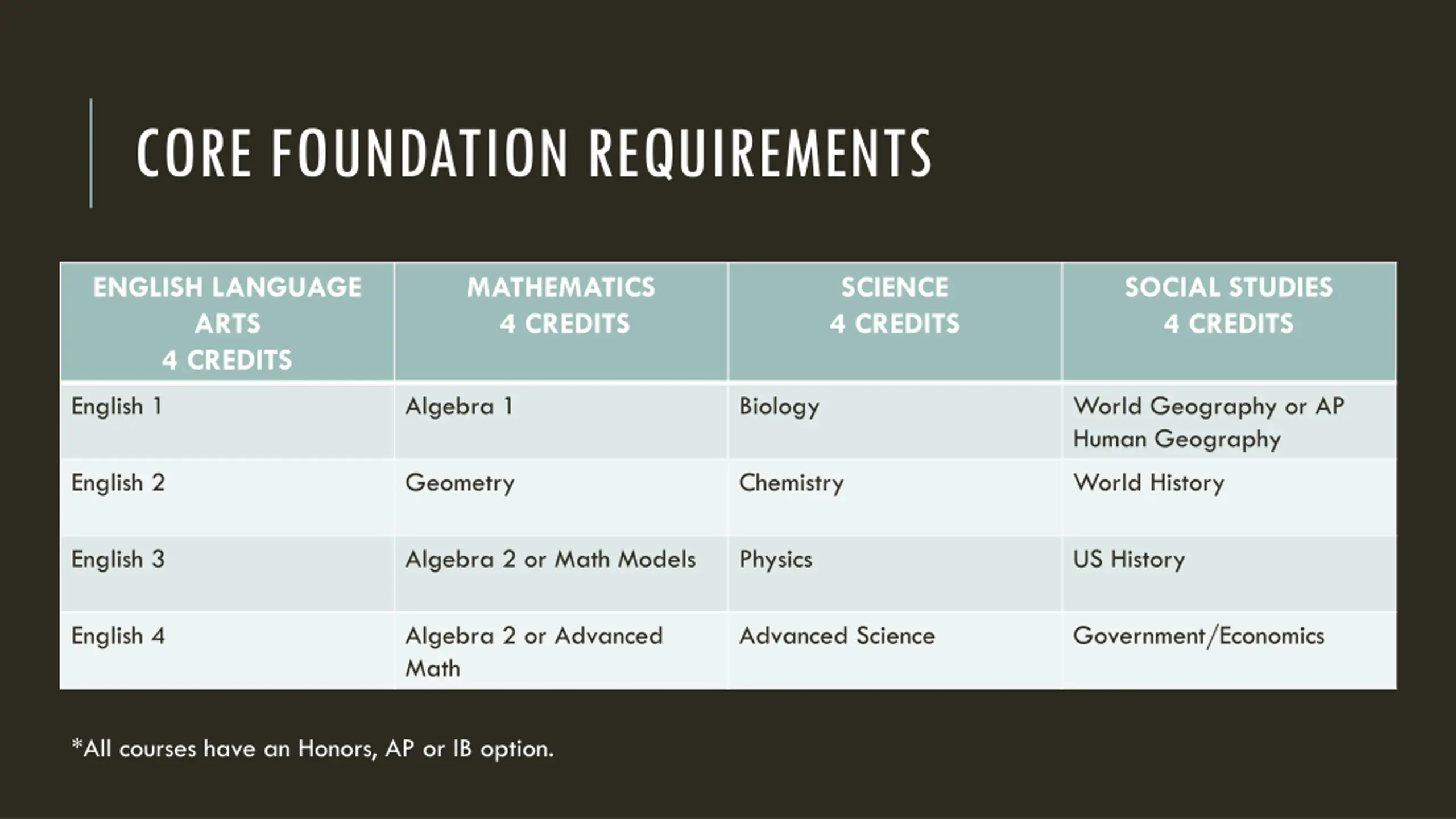 CORE FOUNDATION REQUIREMENTS ENGLISH LANGUAGE ARTS 4 CREDITS MATHEMATICS 4 CREDITS SCIENCE 4 CREDITS SOCIAL STUDIES 4 CREDITS English 1 Algebra 1 Biology World Geography or AP Human Geography English 2 Geometry Chemistry World History English 3 Algebra 2 or Math Models Physics US History English 4 Algebra 2 or Advanced Math Advanced Science Government/Economics *All courses have an Honors, AP or IB option.