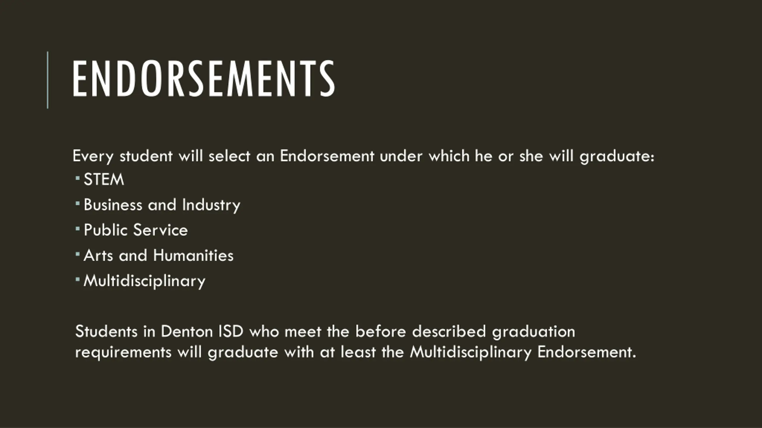 ENDORSEMENTS Every student will select an Endorsement under which he or she will graduate: STEM Business and Industry Public Service Arts and Humanities Multidisciplinary Students in Denton ISD who meet the before described graduation requirements will graduate with at least the Multidisciplinary Endorsement.