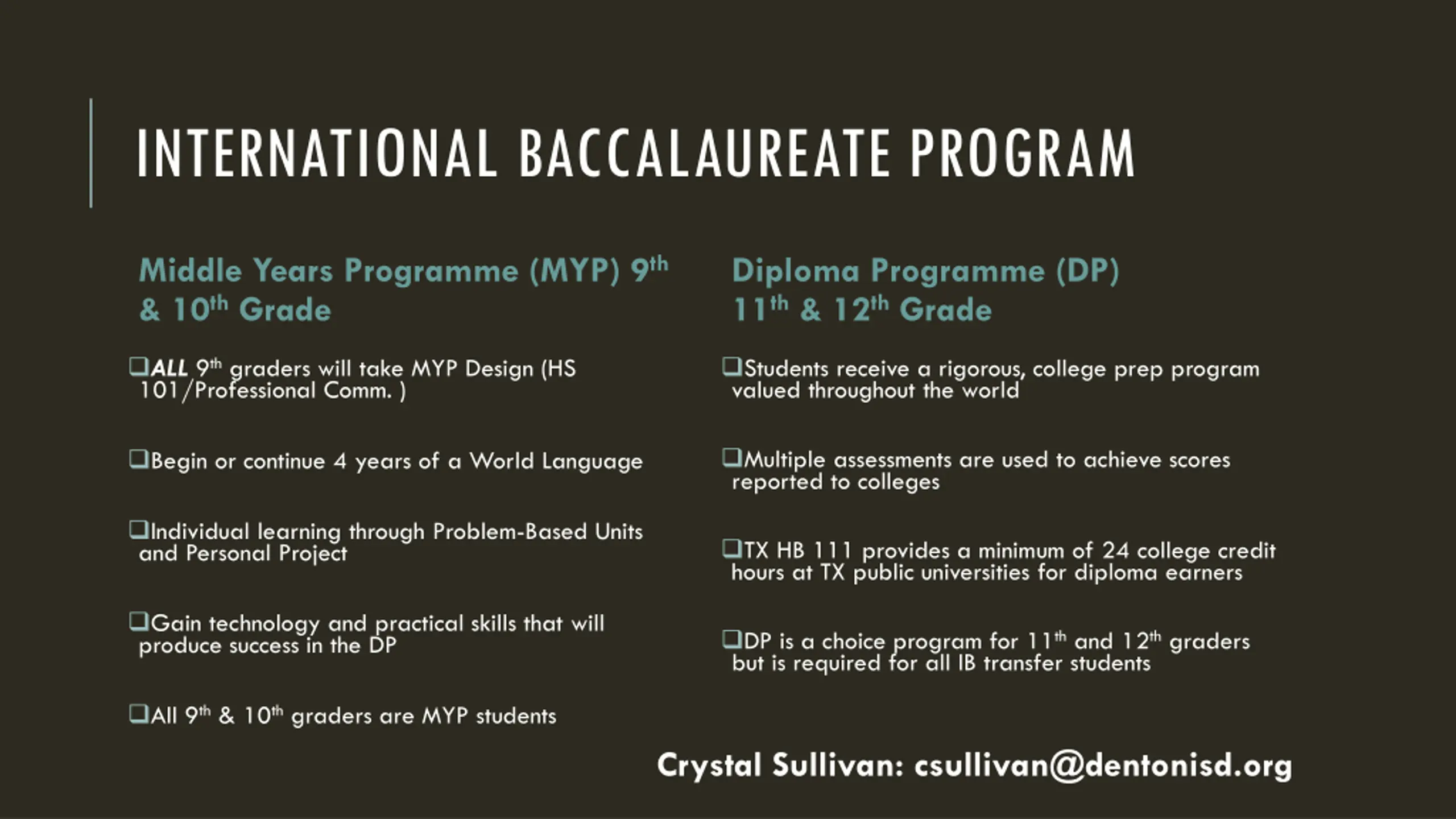 INTERNATIONAL BACCALAUREATE PROGRAM Middle Years Programme (MYP) 9th & 10th Grade Diploma Programme (DP) 11th & 12th Grade ALL 9th graders will take MYP Design (HS 101/Professional Comm. ) Students receive a rigorous, college prep program valued throughout the world Multiple assessments are used to achieve scores reported to colleges Begin or continue 4 years of a World Language Individual learning through Problem-Based Units and Personal Project TX HB 111 provides a minimum of 24 college credit hours at TX public universities for diploma earners Gain technology and practical skills that will produce success in the DP DP is a choice program for 11th and 12th graders but is required for all IB transfer students All 9th & 10th graders are MYP students Crystal Sullivan: csullivan@dentonisd.org