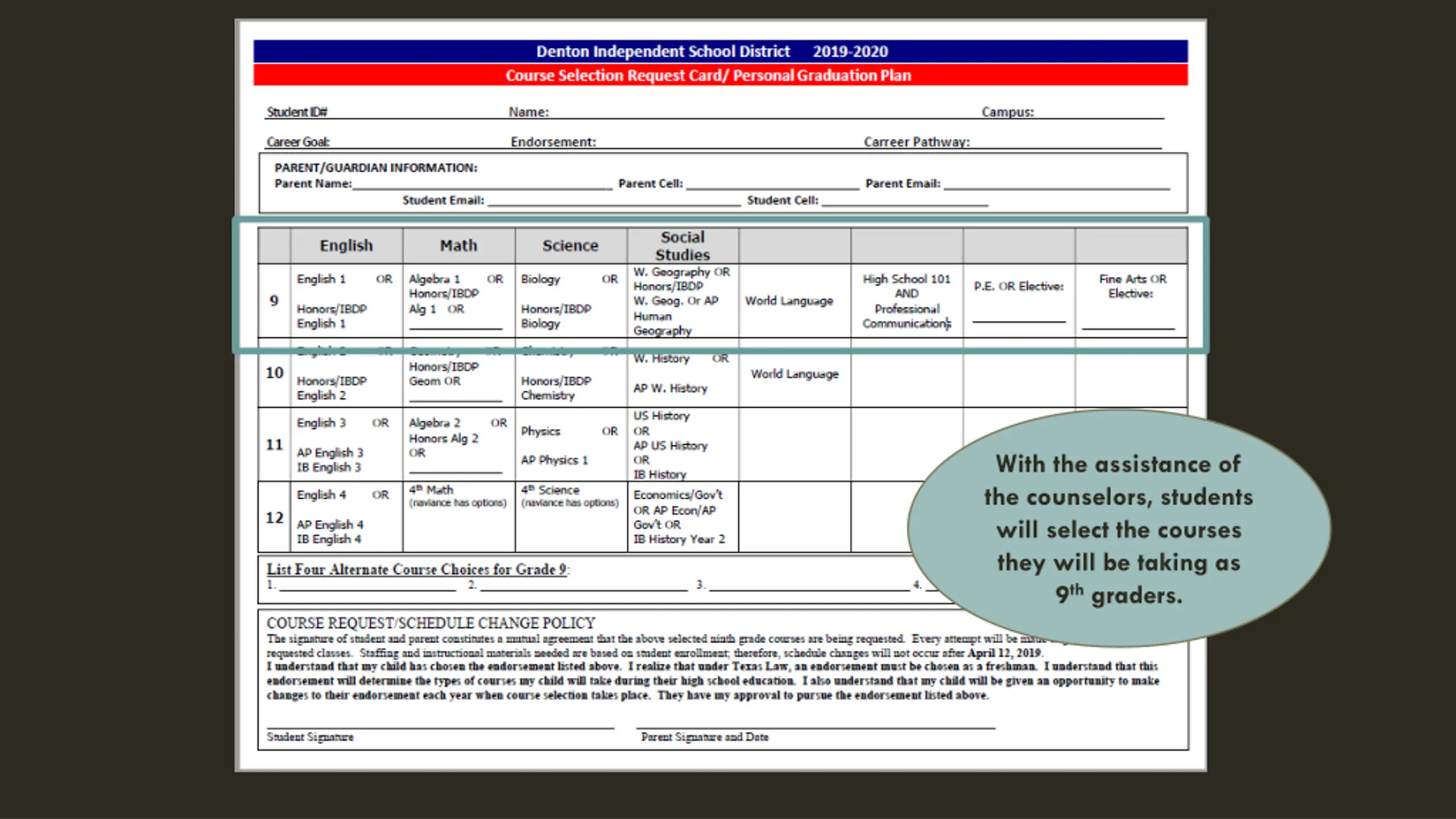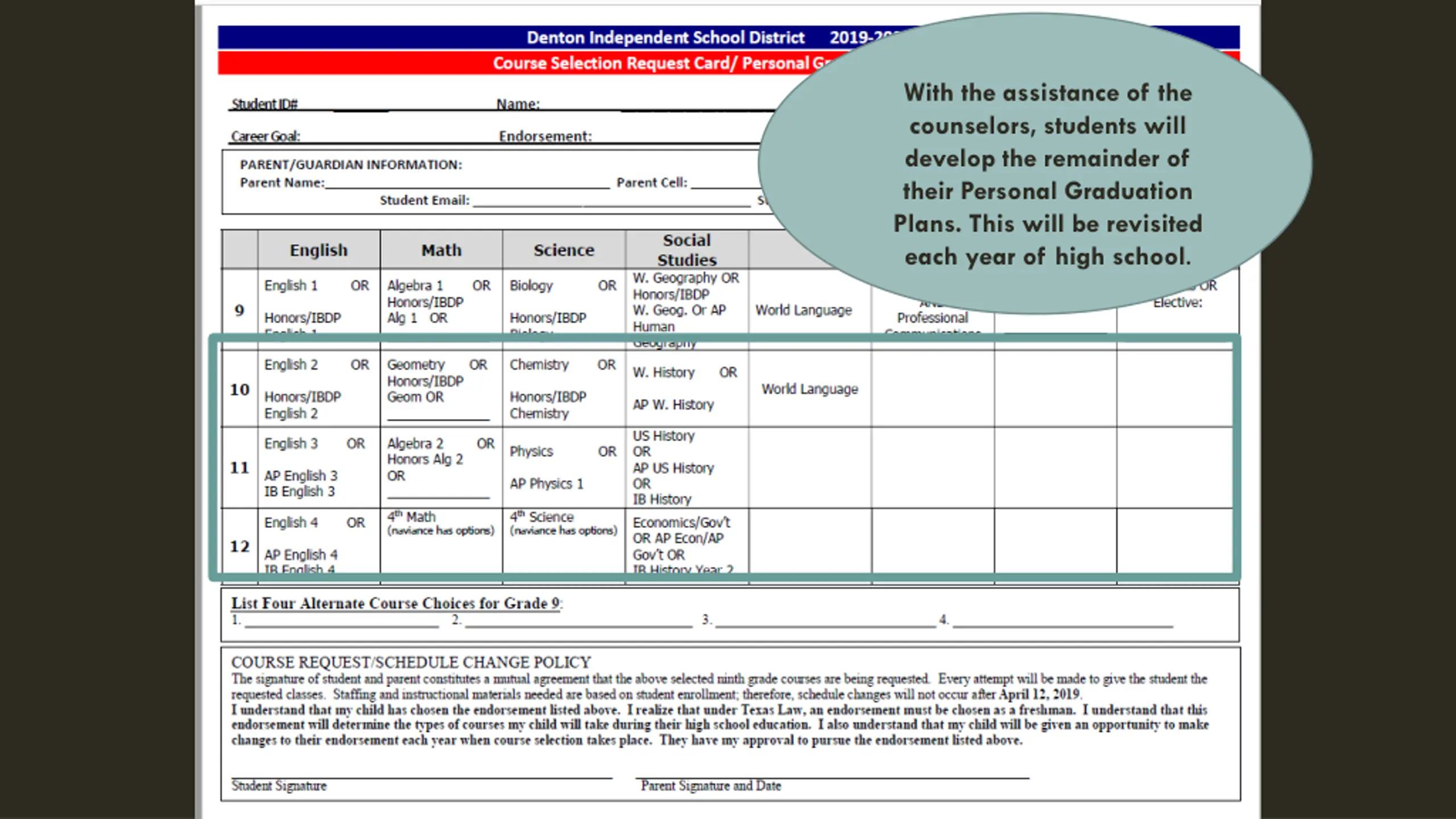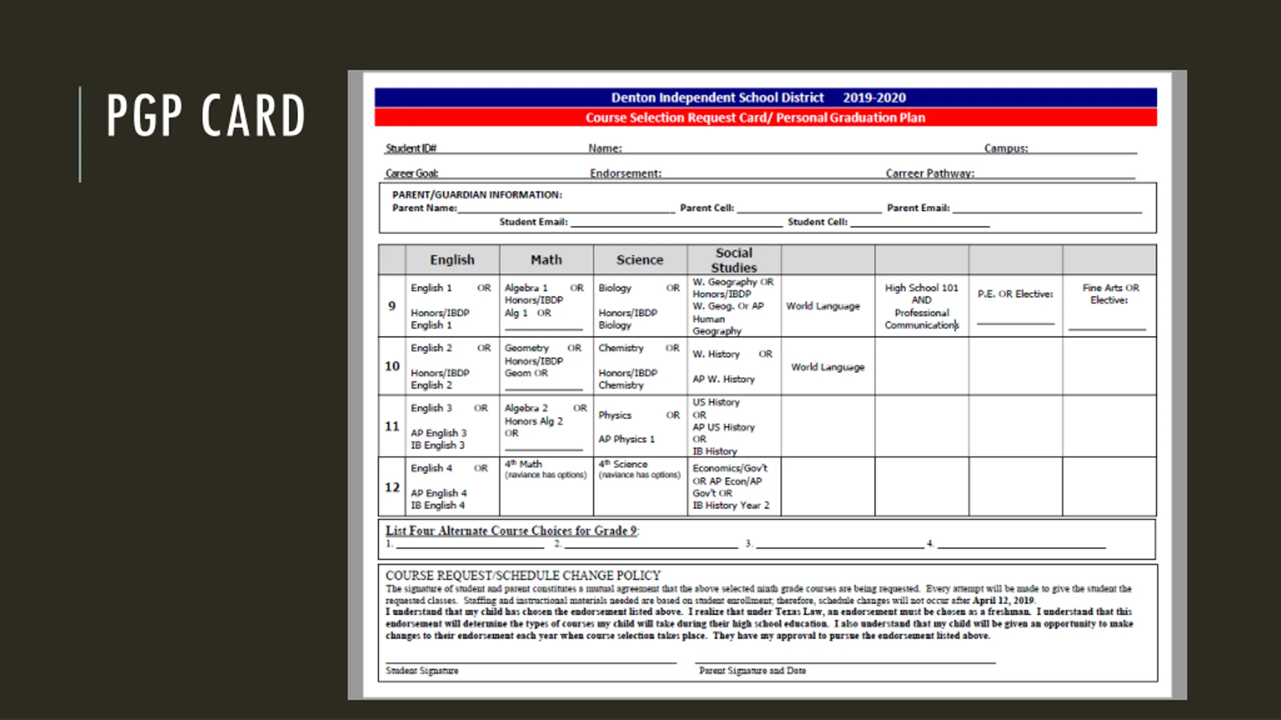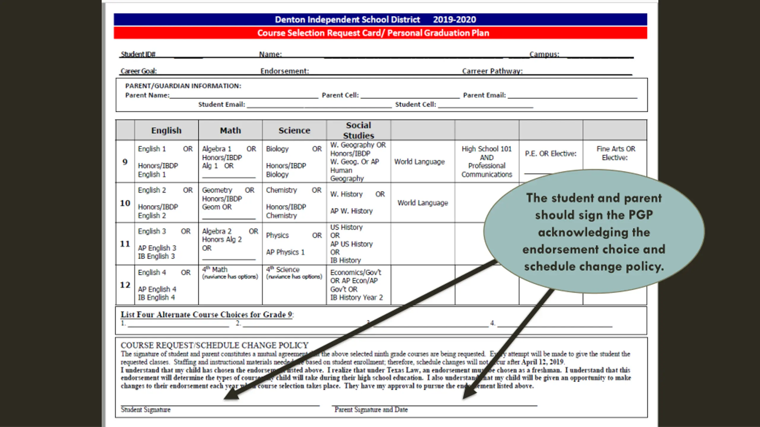 The student and parent should sign the PGP acknowledging the endorsement choice and schedule change policy.