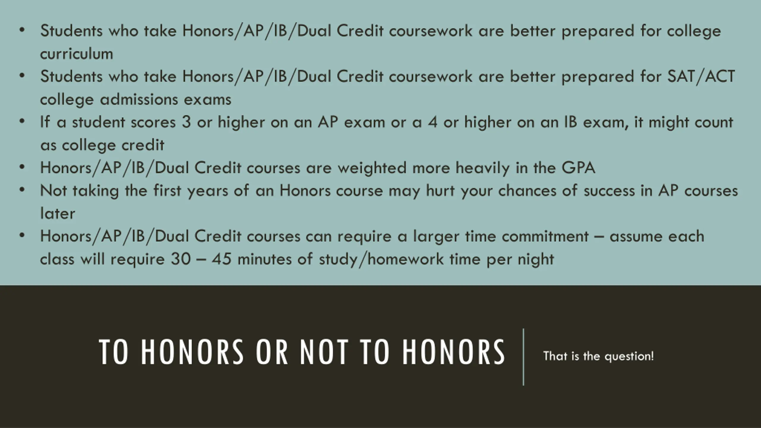 Students who take Honors/AP/IB/Dual Credit coursework are better prepared for college curriculum Students who take Honors/AP/IB/Dual Credit coursework are better prepared for SAT/ACT college admissions exams If a student scores 3 or higher on an AP exam or a 4 or higher on an IB exam, it might count as college credit Honors/AP/IB/Dual Credit courses are weighted more heavily in the GPA Not taking the first years of an Honors course may hurt your chances of success in AP courses later Honors/AP/IB/Dual Credit courses can require a larger time commitment assume each class will require 30 45 minutes of study/homework time per night TO HONORS OR NOT TO HONORS That is the question!
